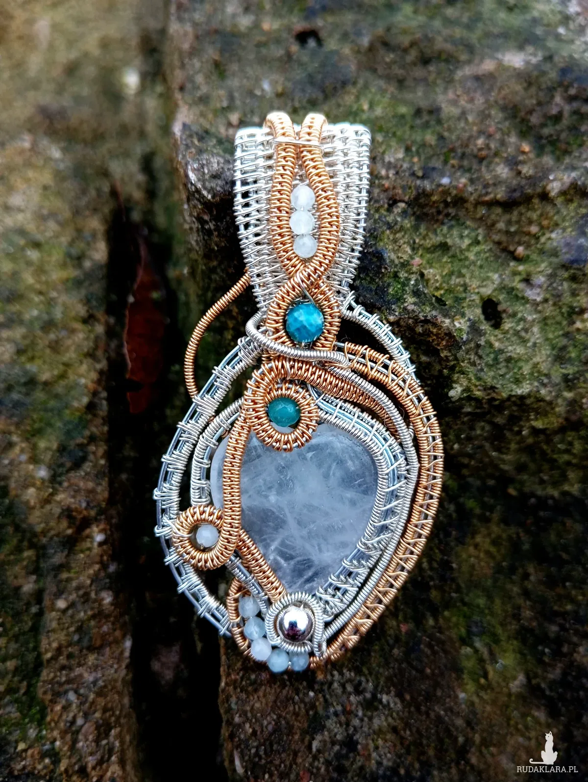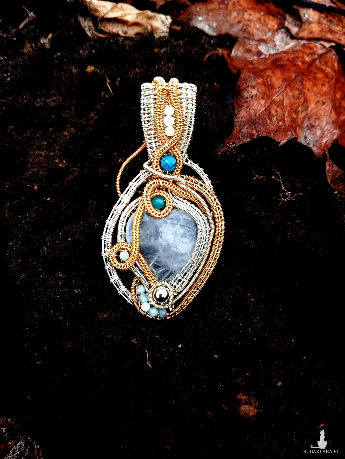 wykonana techniką wirewrappingu, złote i srebrne sploty zimowej aury, okalają