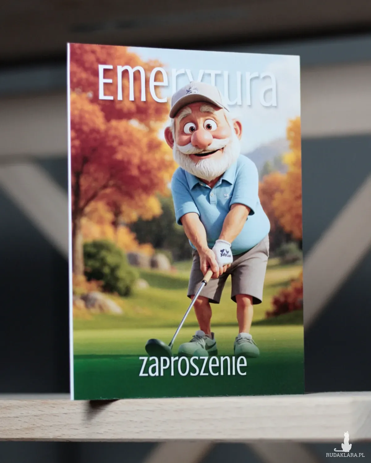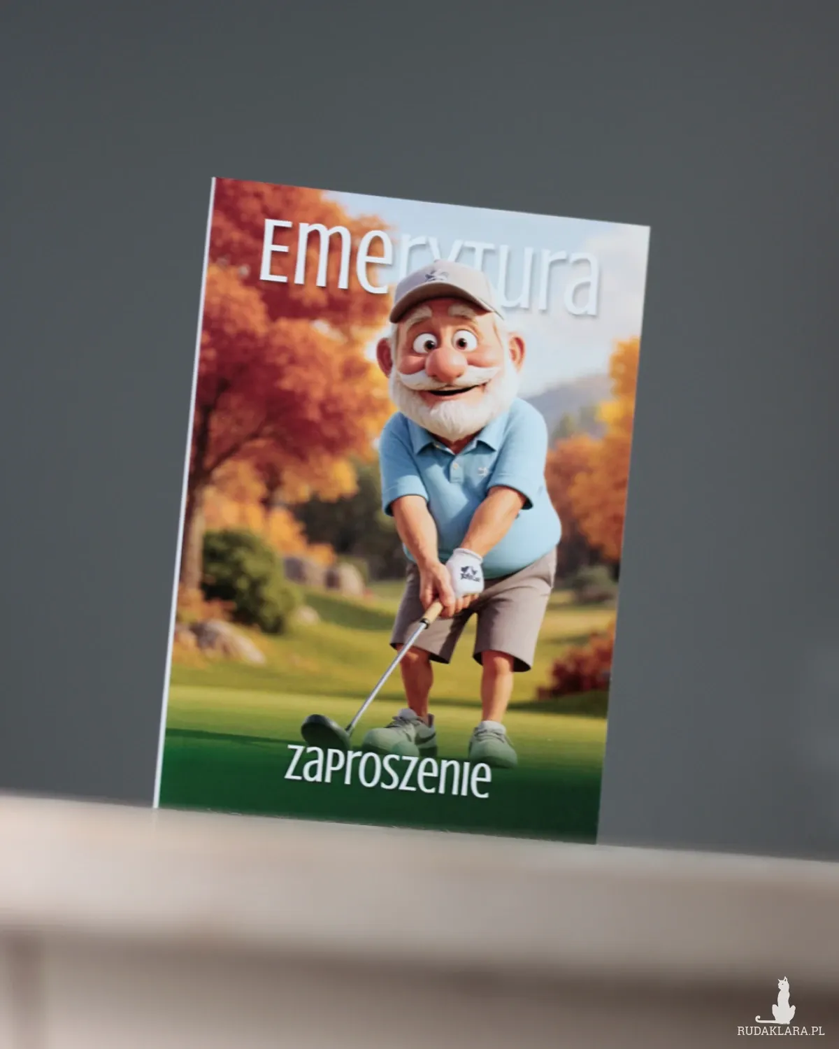 Zaproszenie na imprezę z okazji przejścia na emeryturę. Zaproszenie składane A5 do formatu A6. Wydruk cyfrowy na papierze kredowym o gramaturze 250g.