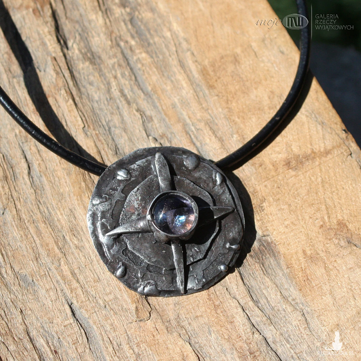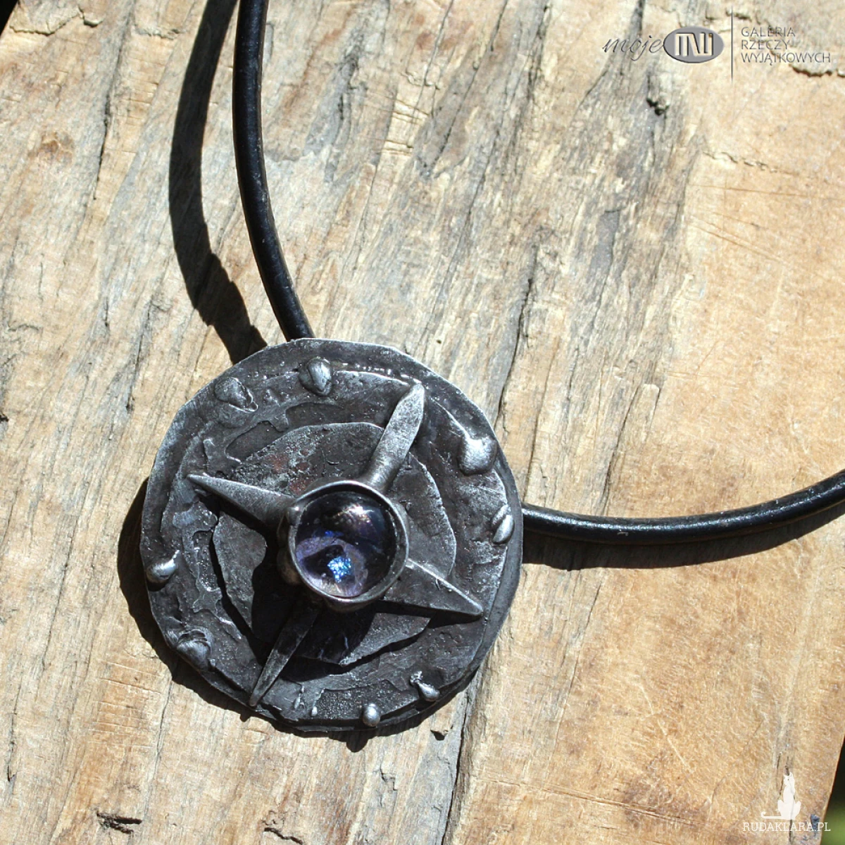 Miedziany wisior w kształcie róży wiatrów - zrobiłam go z trawionej miedzi, pokrytej cyną, spatynowanej i przetartej dla wydobycia szczegółów. W centralnym punkcie jest szklany kaboszon, który wytopiłam metodą fusingu. Wisior zawieszony jest na czarnym skórzanym rzemieniu 3 mm o długości ok. 50 cm