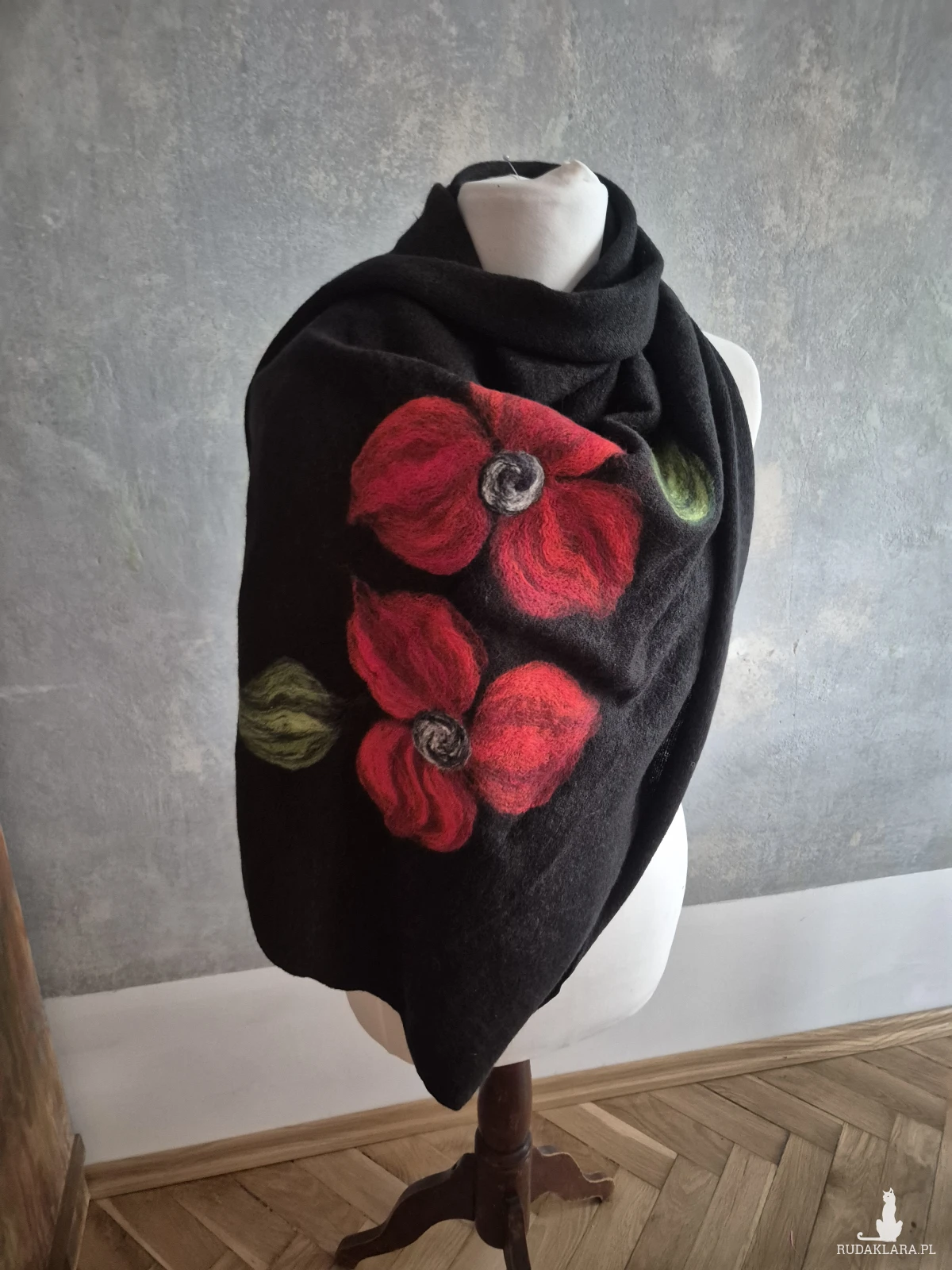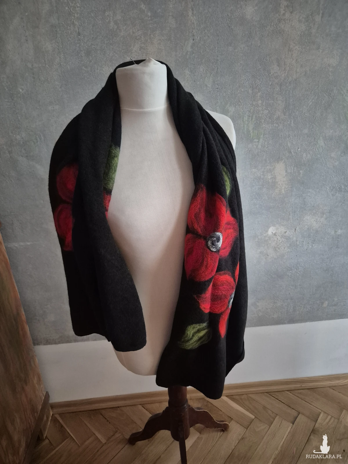 Super prezent na dzień mamy czarny ostatnie bez powtórek filcowany wełniany miły i ciepły szal handmade, owijany dwa razy, filcowany wełną merynosów, bardzo ciepły i miły, doskonały na prezent, fantastyczny na codzienne noszenie, zwraca uwagę, dodaje koloru, nie zginiesz w tym kominie na ulicy, pojedyncze egzemplarze, polecam bestseller,box 11 ostatni