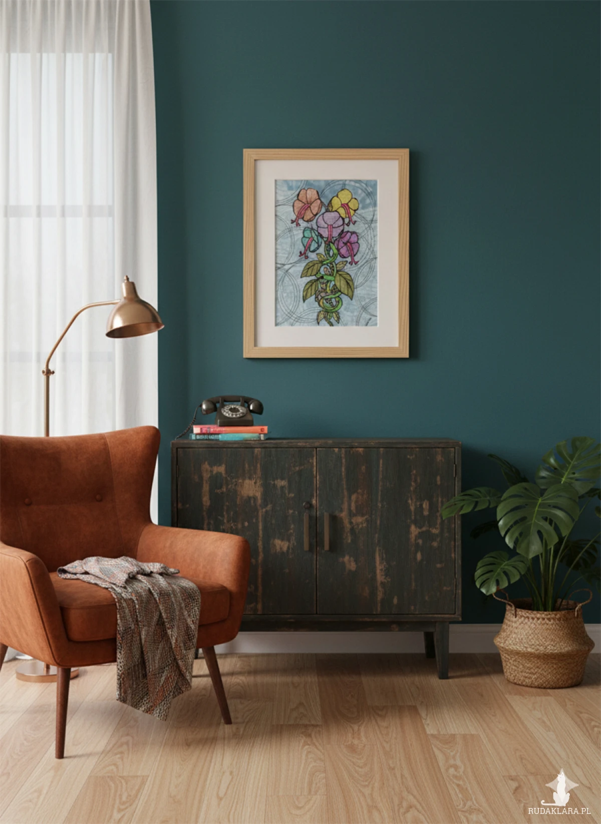 Ze względu na swoją dynamikę i odważną kolorystykę, rysunek ten będzie świetnym punktem centralnym w nowoczesnym gabinecie lub salonie w stylu dark academia.