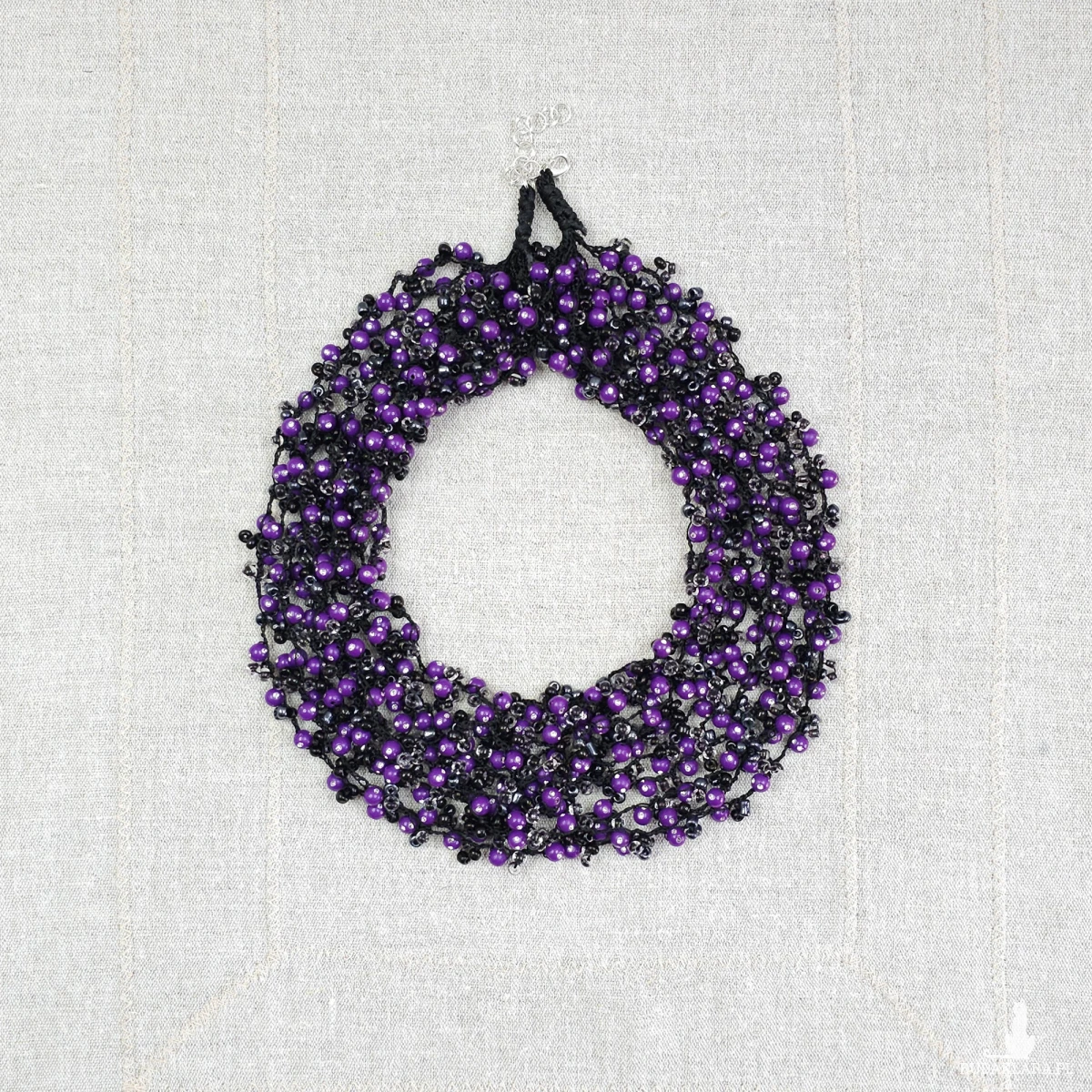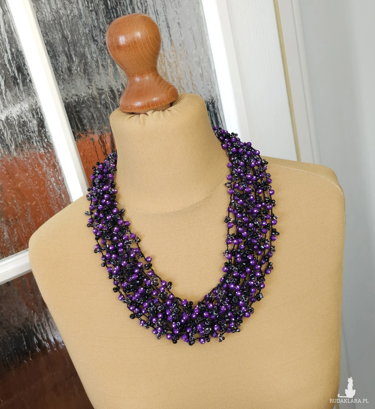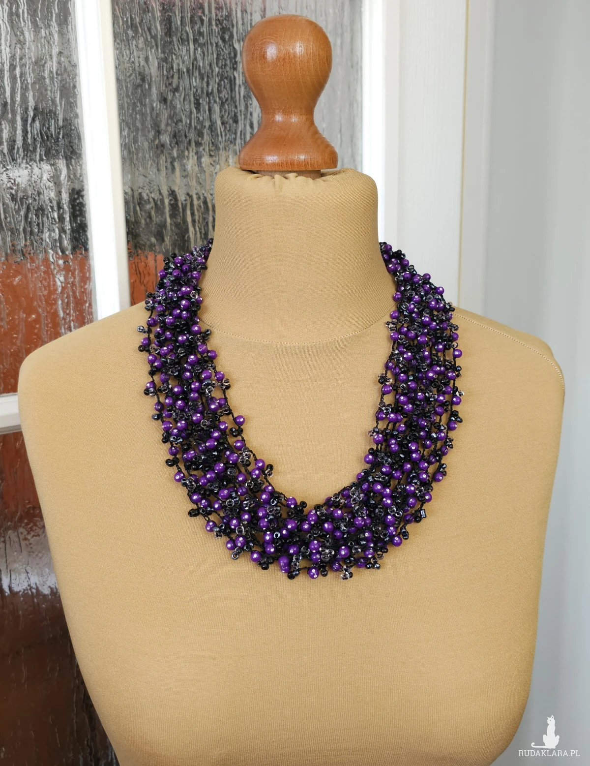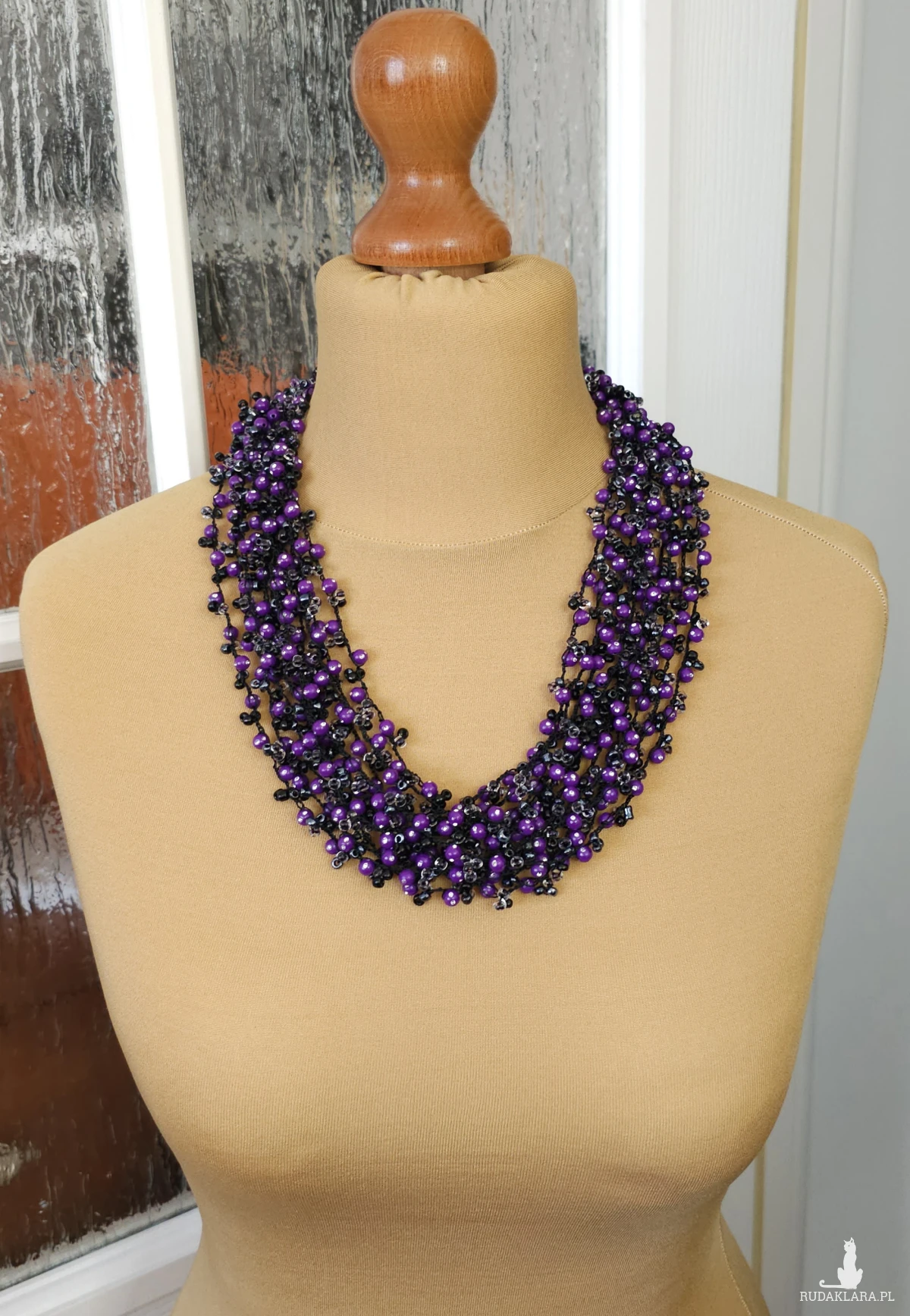Dopełnij swoją stylizację wyjątkowym, ręcznie wykonanym naszyjnikiem w odcieniach intensywnego fioletu i klasycznej czerni. Naszyjnik został wykonany techniką szydełkową z setek drobnych koralików, co nadaje mu niezwykłą objętość przy jednoczesnym zachowaniu lekkości.