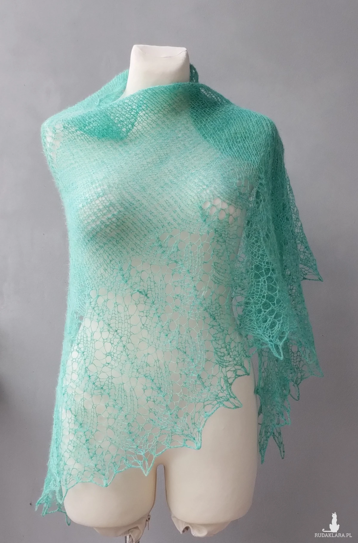 z mieszanki wełny,moheru i akrylu w kolorze turkusowym.Chusta mgiełka.Wymiary: szerokość 210cm, długość 95 cm. Prać ręcznie w temperaturze 30 stopni, suszyć na leżąco .