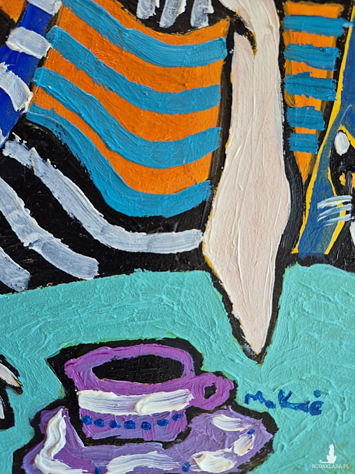 Na dole — filiżanka. Mała, fioletowa, niepozorna, a jednak znacząca. Jak pauza w rozmowie. Jak ślad codzienności w świecie zbudowanym z koloru i symbolu.