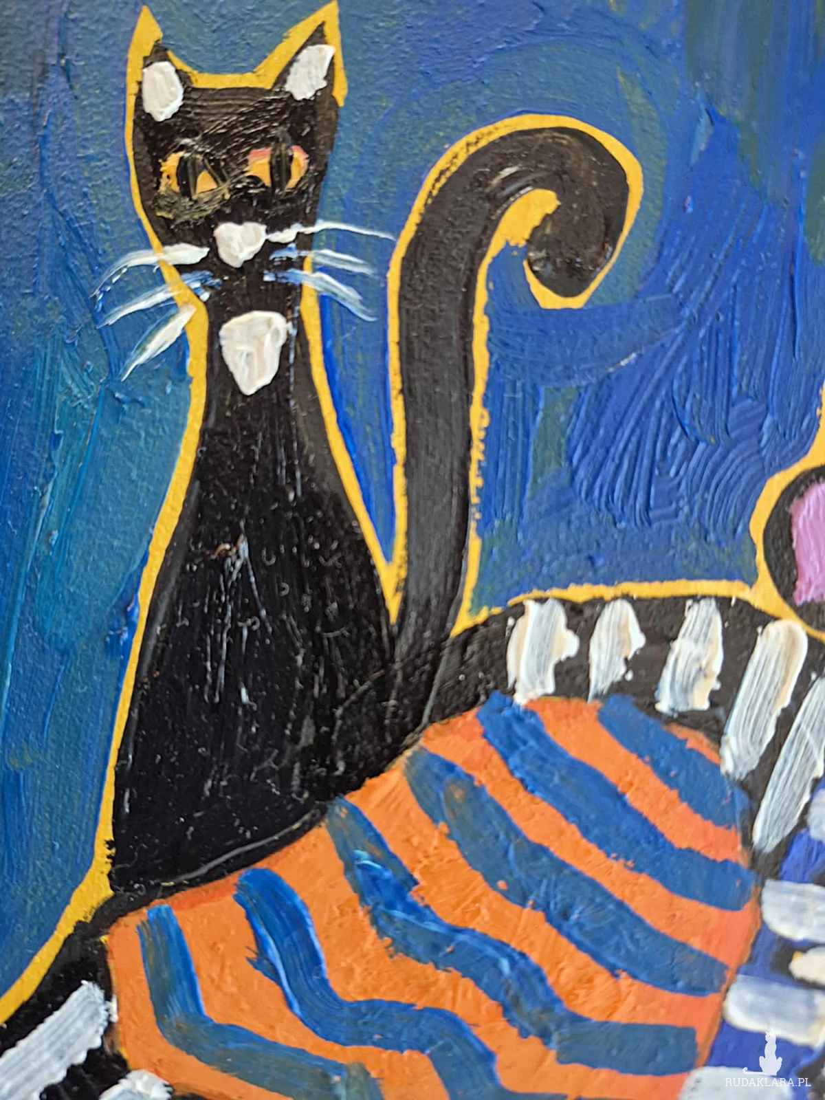 Za nią i obok niej pojawiają się koty: czarne, smukłe, niemal totemiczne. Nie są tylko zwierzętami — są strażnikami nastroju, cichymi świadkami sceny. Ich żółte oczy kontrastują z chłodnym, głębokim błękitem tła, które otula całość niczym nocna cisza.