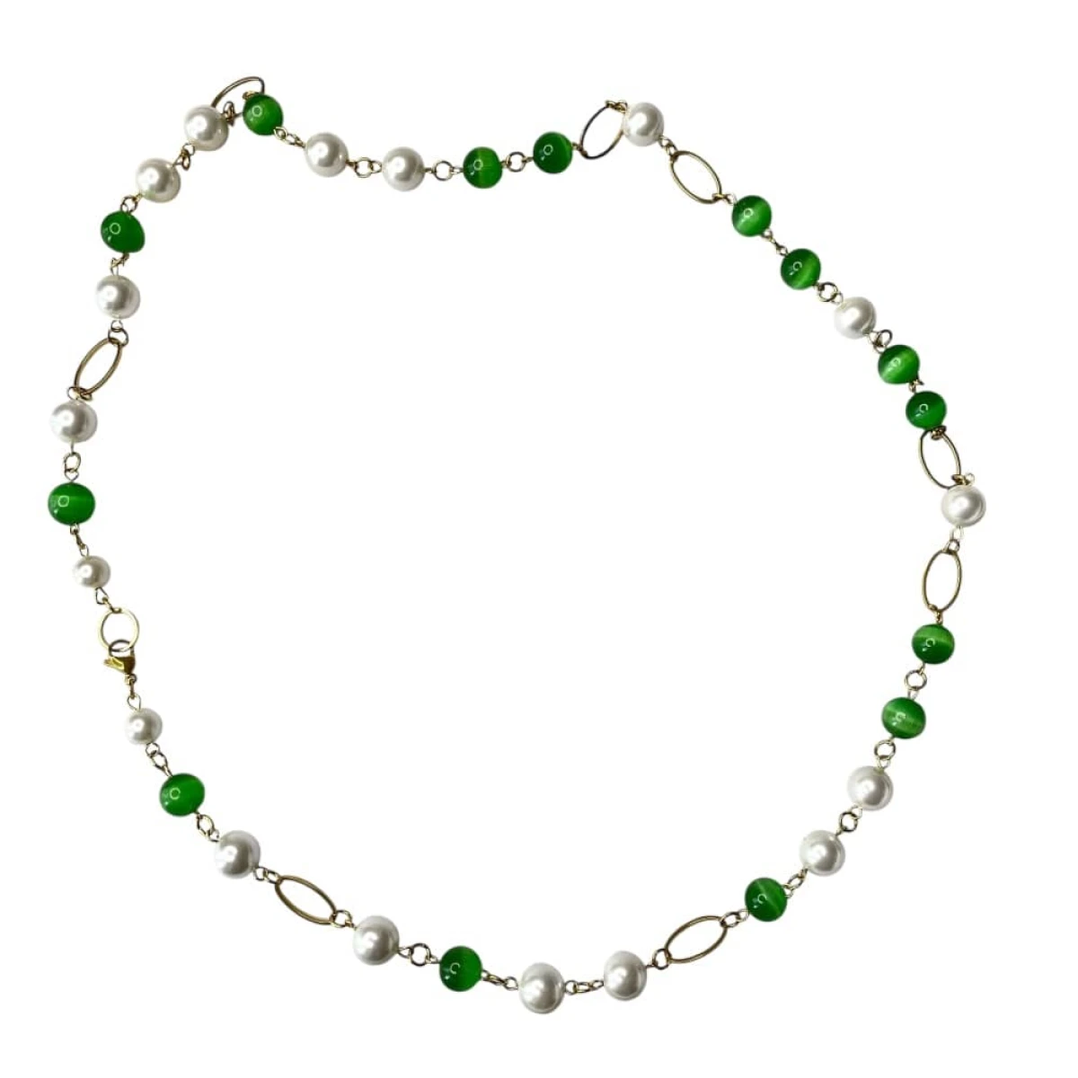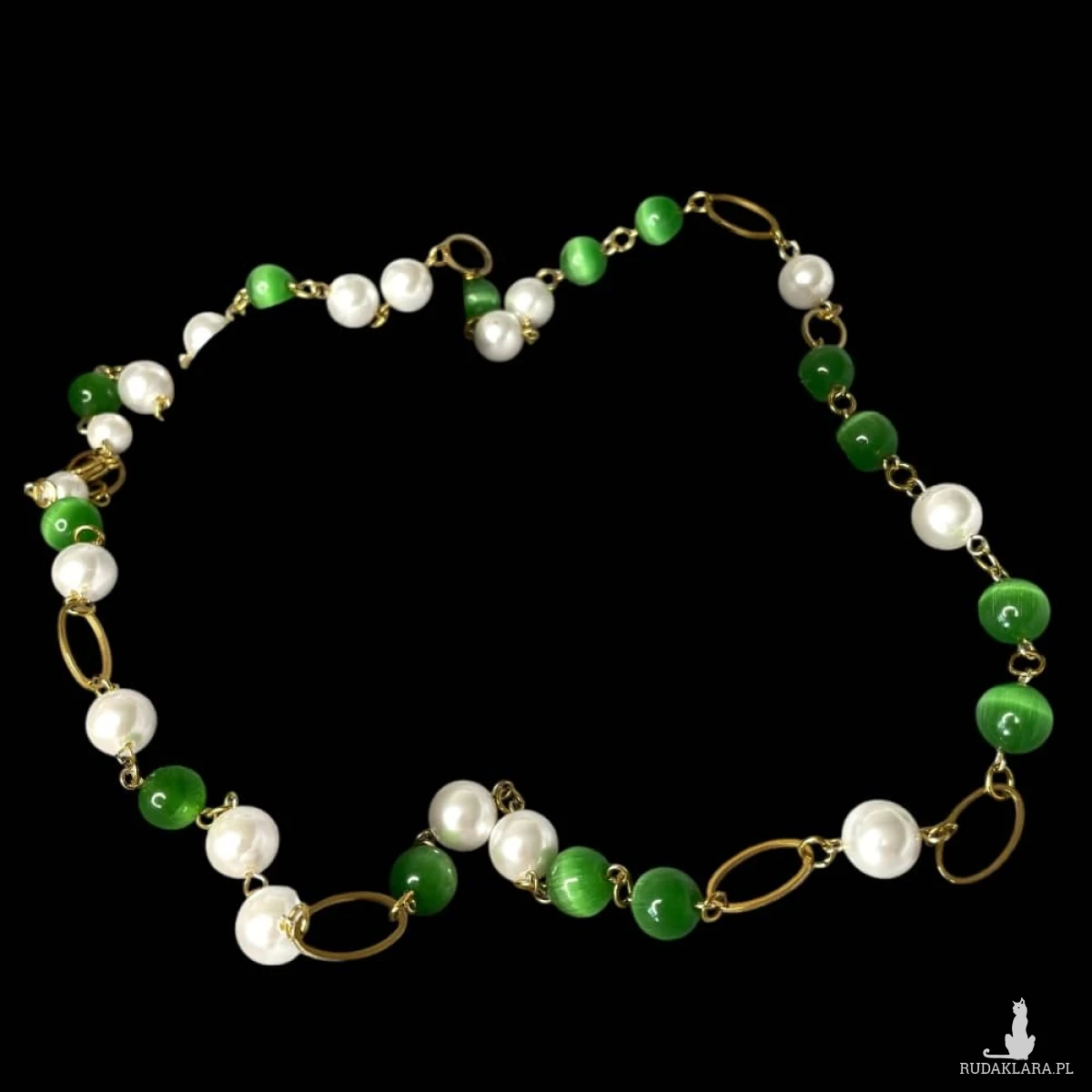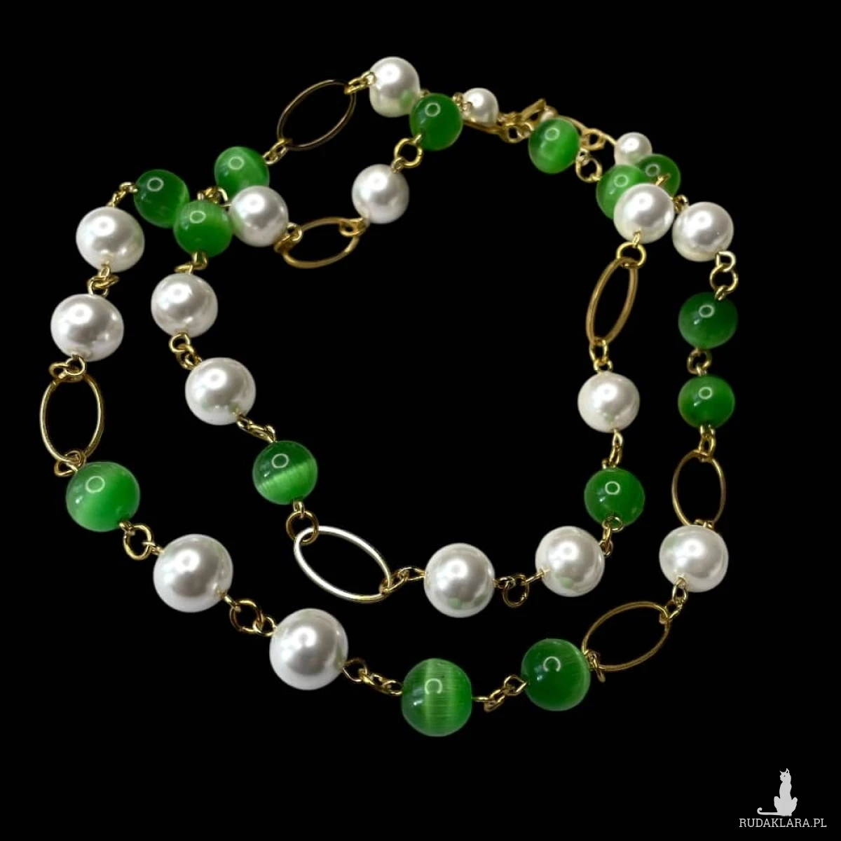 Naszyjnik z perłami i zielonym kocim okiem to elegancka interpretacja klasyki w nowoczesnym wydaniu. Lekka forma oparta na owalnych ogniwach tworzy subtelną, harmonijną całość, w której naturalny blask pereł spotyka się z głęboką zielenią kamieni o charakterystycznym, migotliwym połysku. Efekt kociego oka wprowadza nutę tajemniczości i głębi, a złocone detale delikatnie podkreślają szlachetny charakter kompozycji. To biżuteria, która zachwyca równowagą między ponadczasową elegancją a świeżym, współczesnym akcentem.