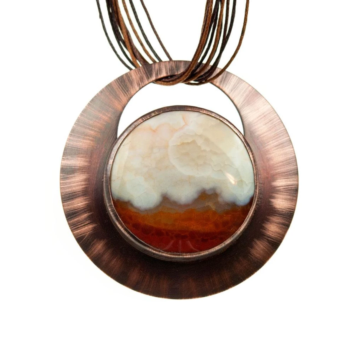 Wisior został wykonany ręcznie z blachy miedzianej i okrągłego agatu. Kamień ma średnicę ok. 40-45 mm i cechuje się wybarwieniem, które przywodzi na myśl intensywny wybuch wulkanu lub chmury unoszące się nad pustynią. W procesie tworzenia wisiora blacha była polerowana, matowiona, a następnie malowana oksydą i przecierana, dzięki czemu powstał niepowtarzalny efekt kolorystyczny. Blacha otaczająca agat jest lekko wypukła oraz zabezpieczona warstwą ochronną. Miedziane koło, którego centralnym elementem jest jedyny w swoim rodzaju agat, ma średnicę ok 7 cm.