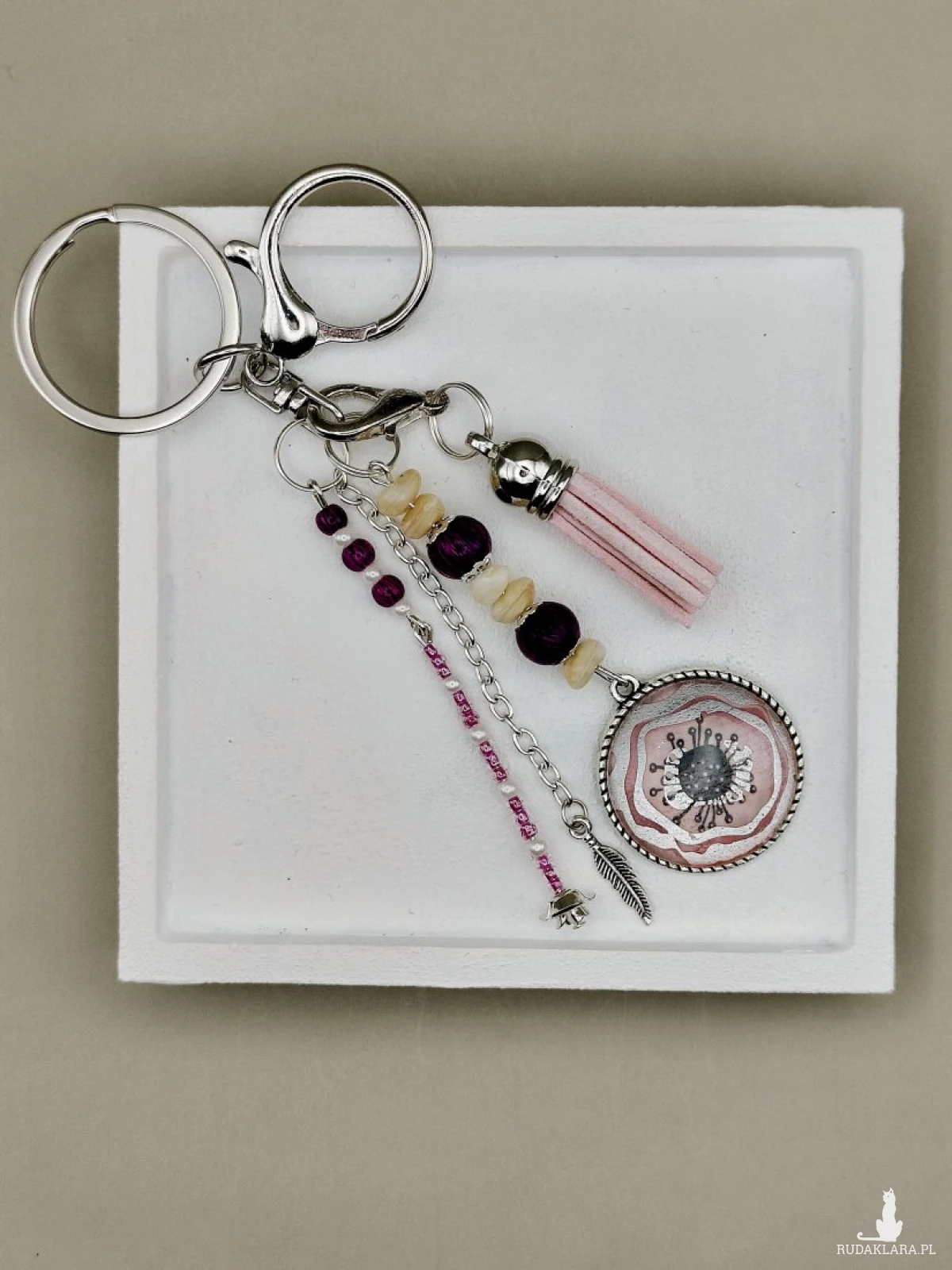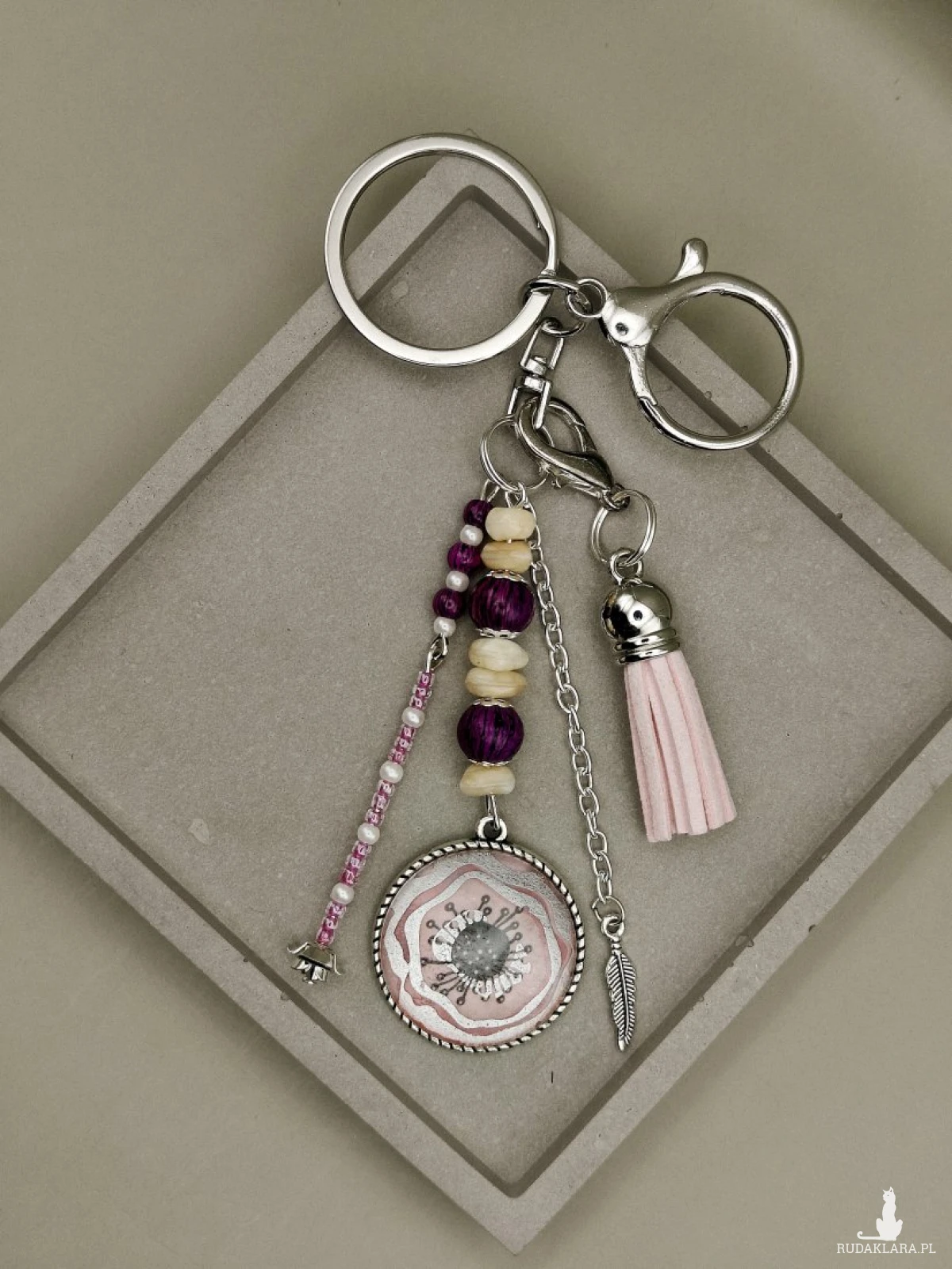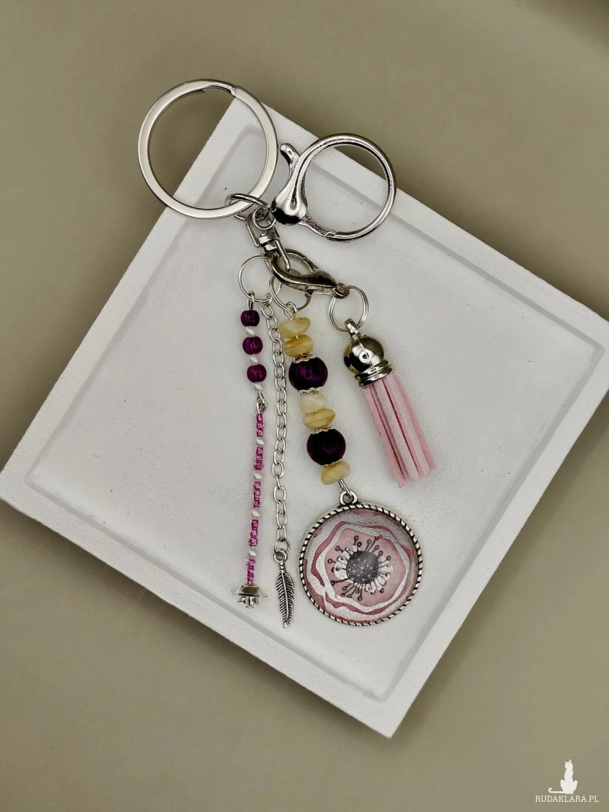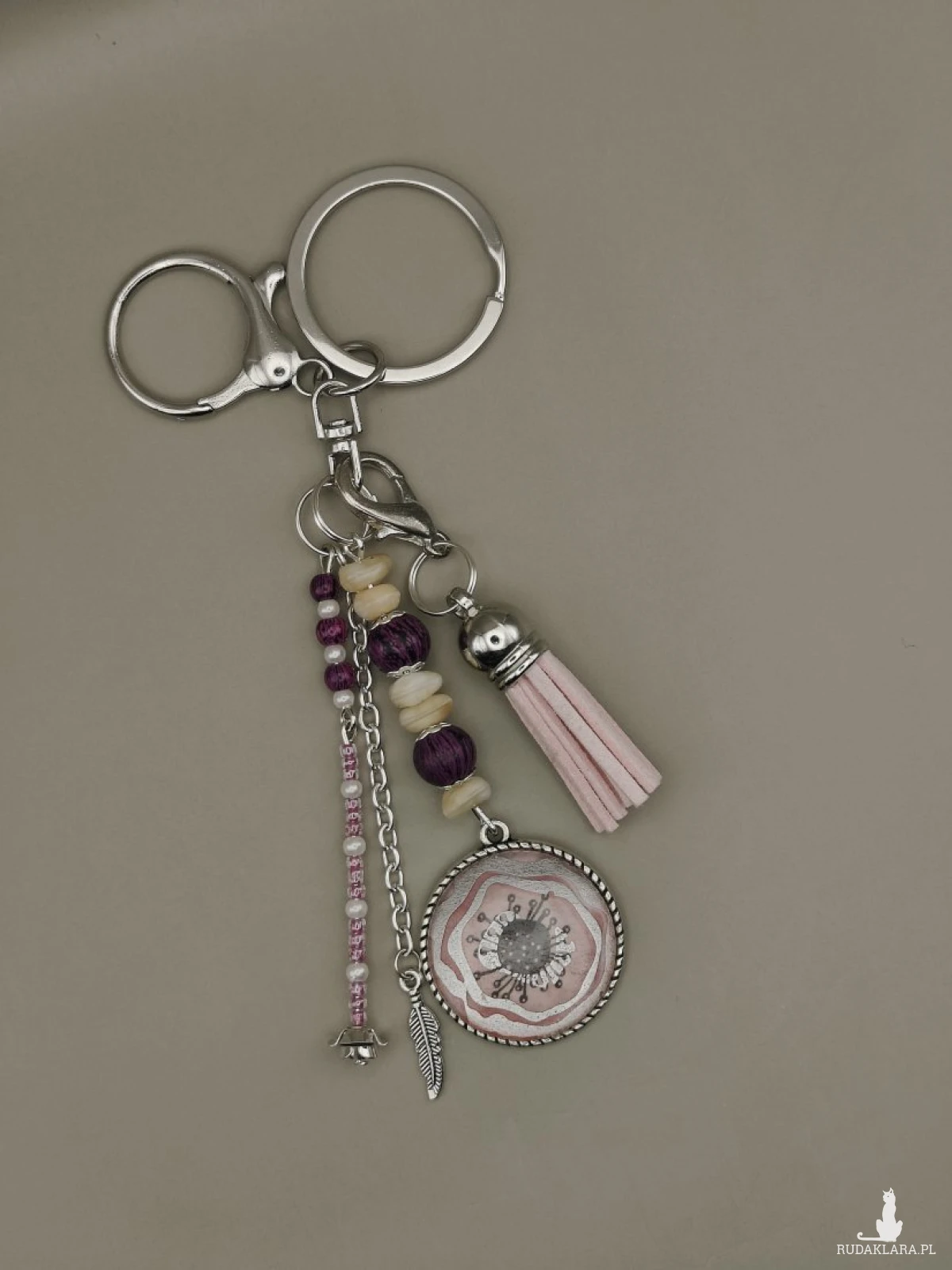 Wyjątkowy brelok handmade, który łączy delikatność pudrowego różu z elegancją srebrnych detali. Kompozycja koralików, subtelnego chwosta oraz okrągłej zawieszki z motywem kwiatowym sprawia, że brelok jest nie tylko praktycznym dodatkiem, ale także stylową biżuterią do kluczy, torebki lub plecaka. Idealny dla osób ceniących unikatowe, ręcznie wykonane akcesoria z duszą.