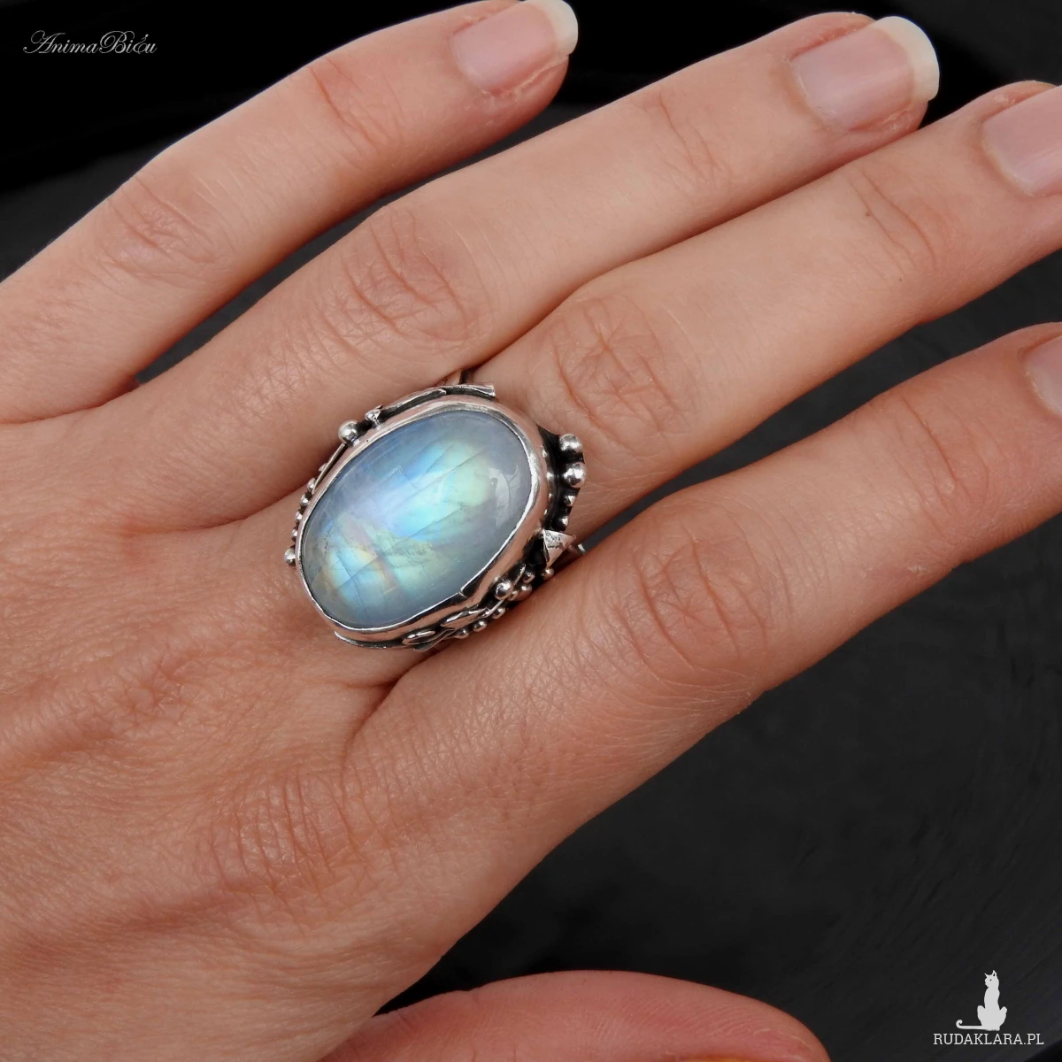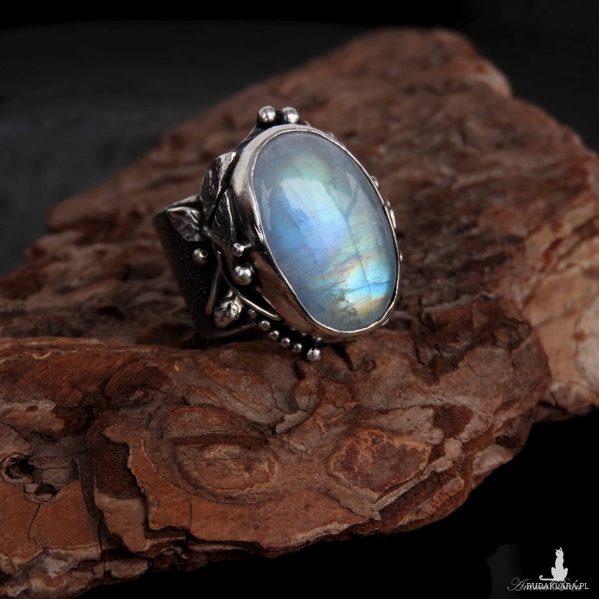 Pierścionek srebrny z tęczowym kamieniem księżycowym.