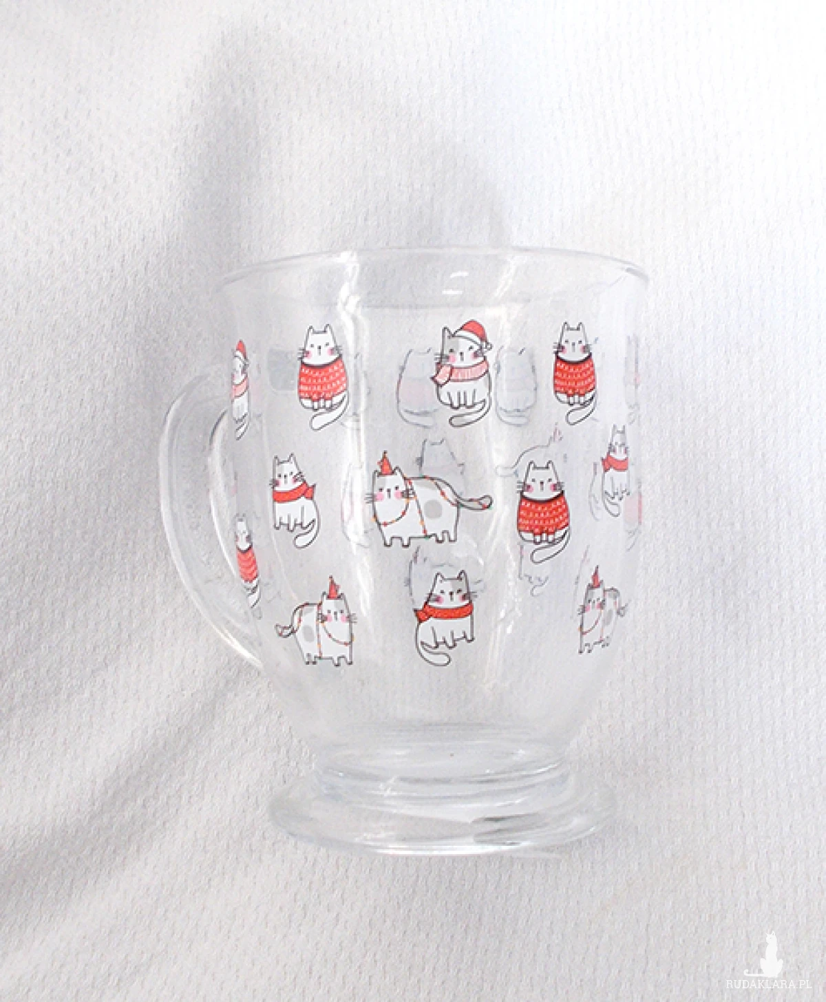 Nowy kubek z grubego szkła, wzór w kotki. Wymiary ok. wysokość 10 cm, szerokość z uchem 11 cm, średnica 8 cm. Myć ręcznie (nie nadaje się do zmywarki ani mikrofalówki.)