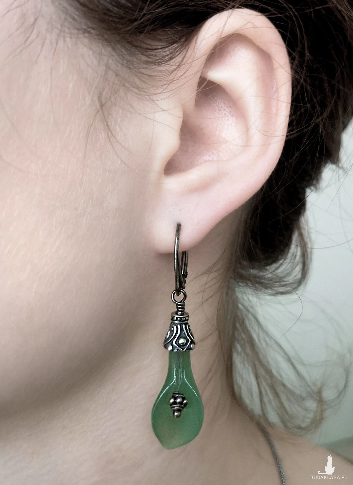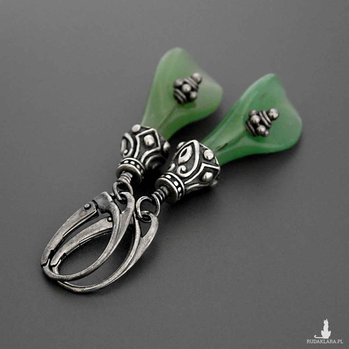 Kolczyki Scarlett, jadeitowe kalie, srebro patynowane, kolekcja Przeminęło z Wiatrem