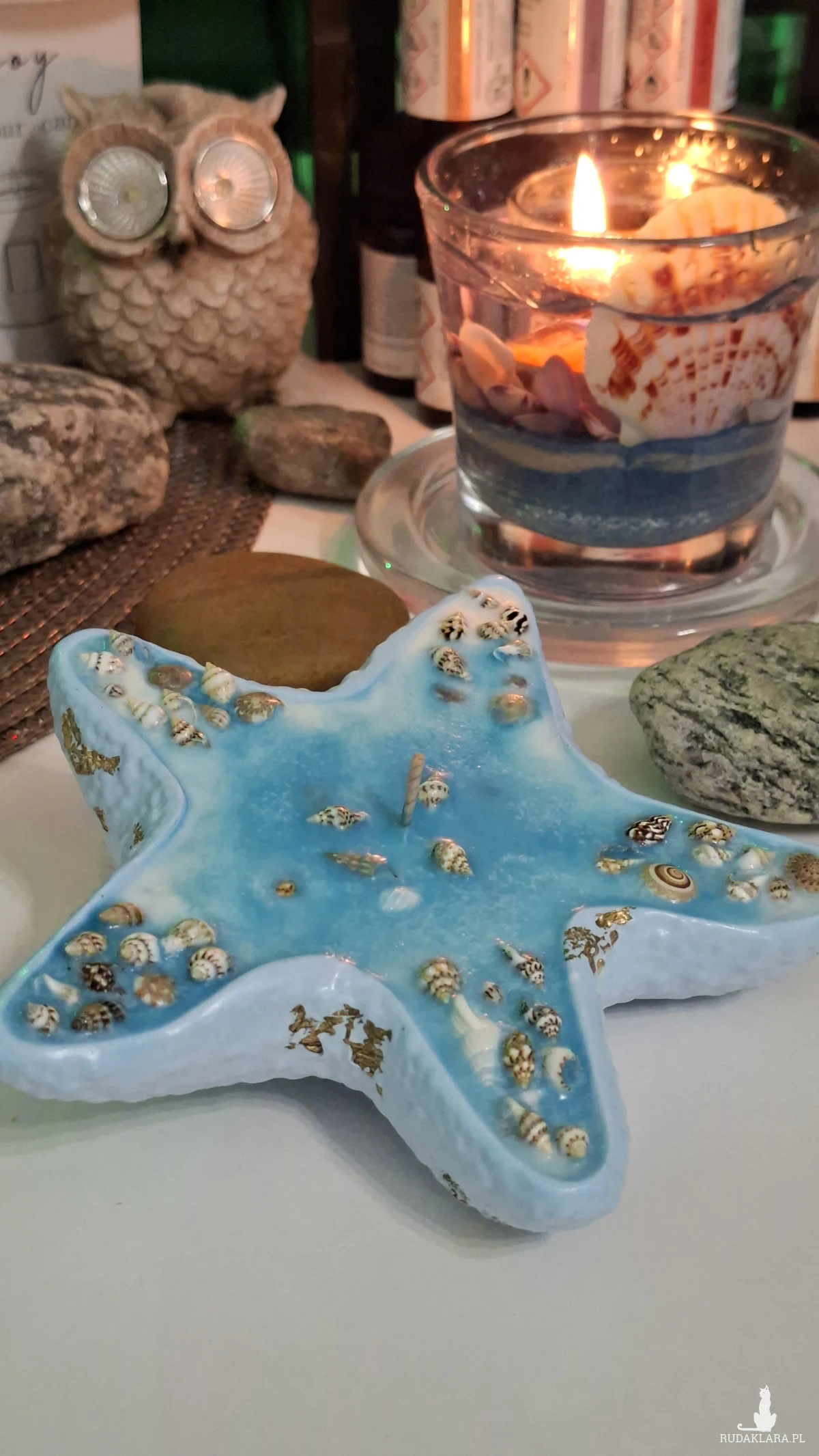 Świeca sojowa w kształcie rozgwiazdy z muszelkami. To wyjątkowy element dekoracyjny inspirowany morskim klimatem. Starannie wykonane detale wprowadzają do wnętrza atmosferę relaksu, wakacji i letniego spokoju. Idealna jako ozdoba lub oryginalny prezent.