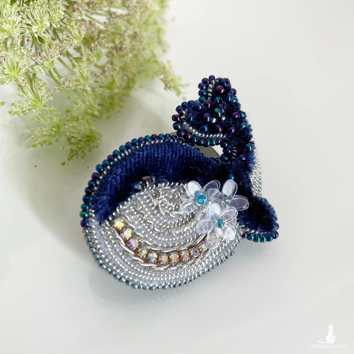 Górna część broszki ozdobiona jest metalizowanymi koralikami japońskimi, a brzuszek ze srebrnego bajorka pięknie mieni się w promieniach światła.