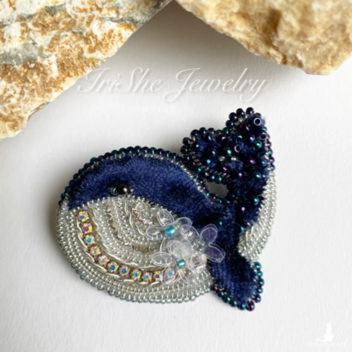 Wyjątkowa, lekka broszka "Wieloryb" w odcieniach granatu i srebra, ręcznie haftowana na filcu. Nie można patrzeć bez uśmiechu na tego uroczego małego wielorybka. Broszka poprawi nastrój właścicielce i wszystkim, którzy na nią spojrzą.
