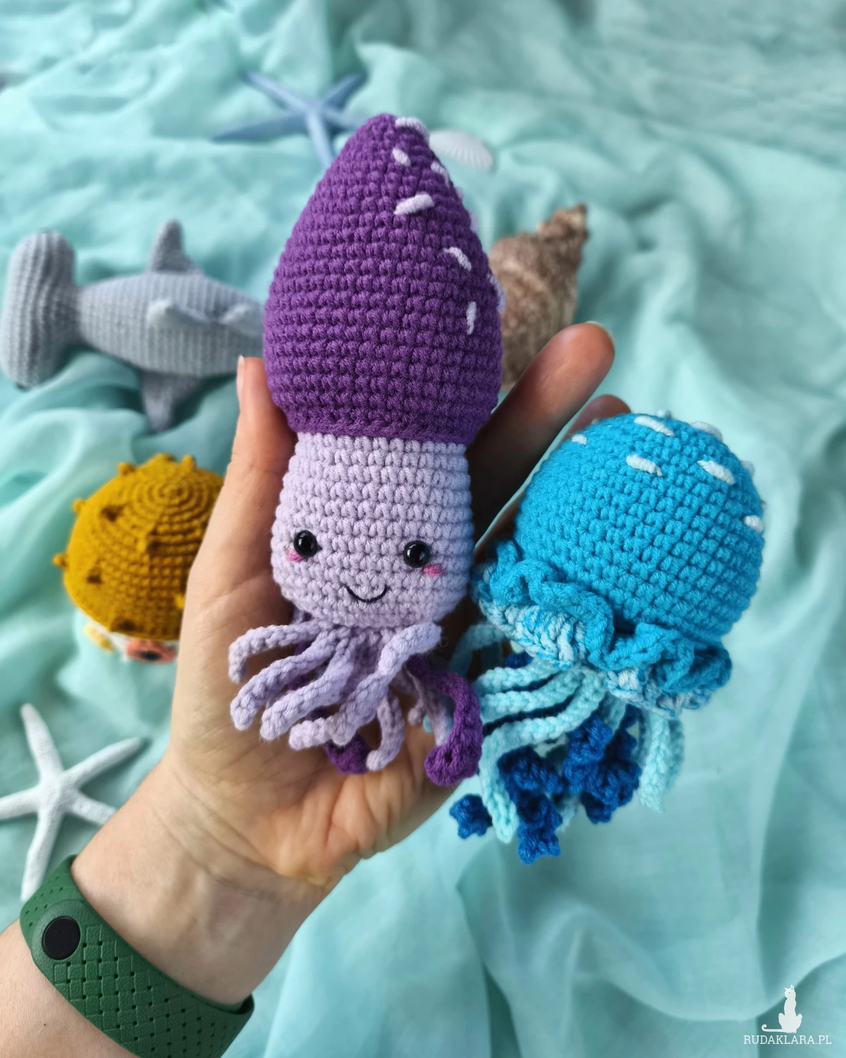 Morskie zwierzęta nie są zbyt małe, co sprawia, że są bardziej zauważalne i mniej prawdopodobne, że zgubią się w dziecięcym pokoju. Zwierzęta wykonane są z wysokiej jakości włóczki półbawełnianej (55% bawełny, 45% akrylu).