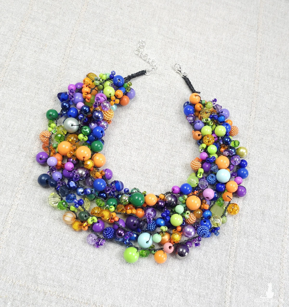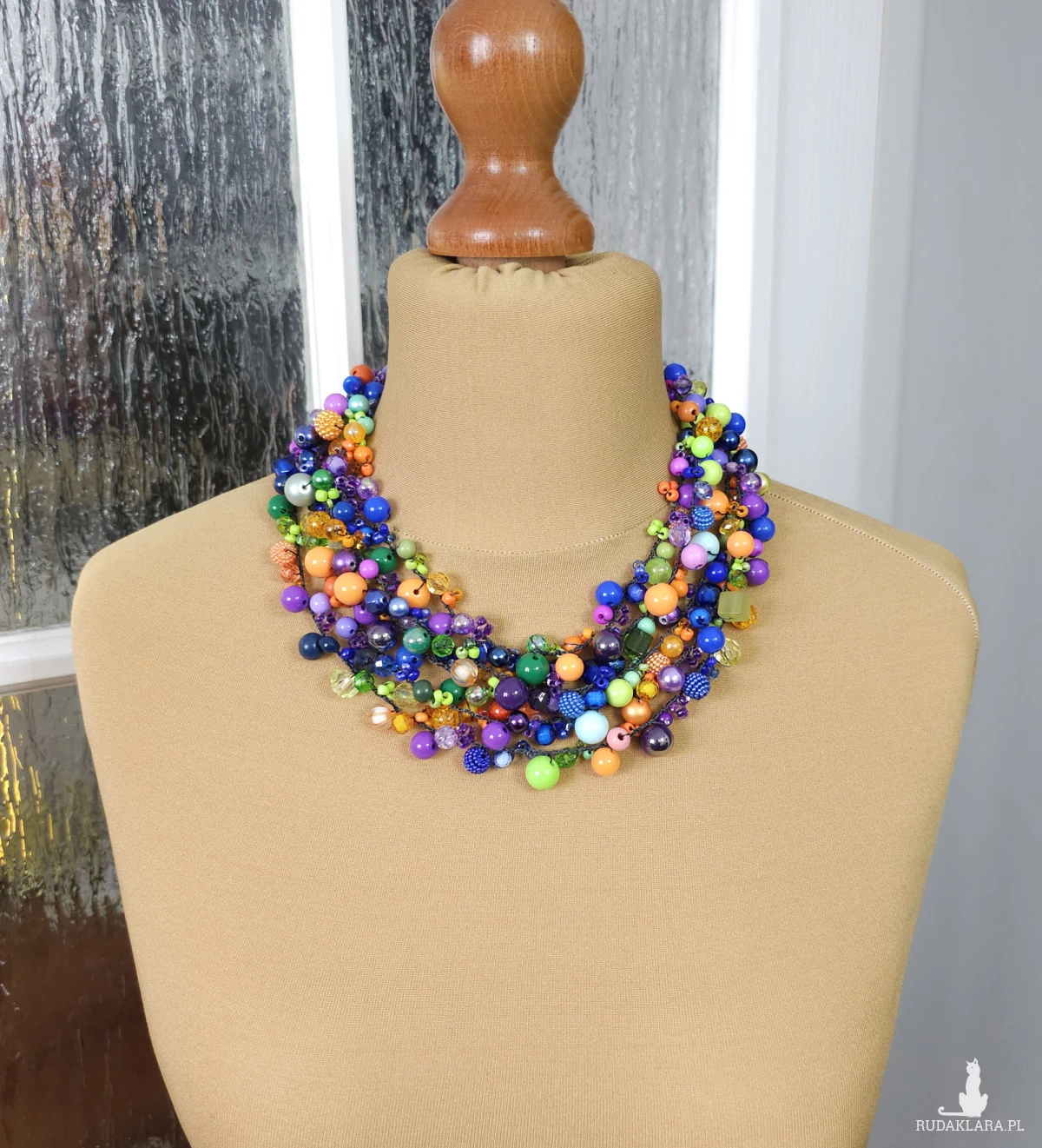Ten efektowny naszyjnik to starannie skomponowana mieszanka koralików o różnych kształtach, wielkościach i wykończeniach – od soczystych matów po błyszczące przezroczystości.