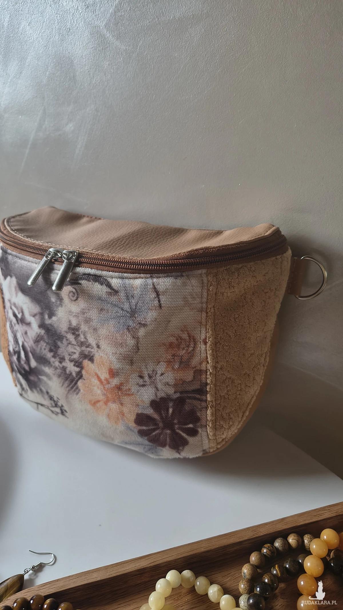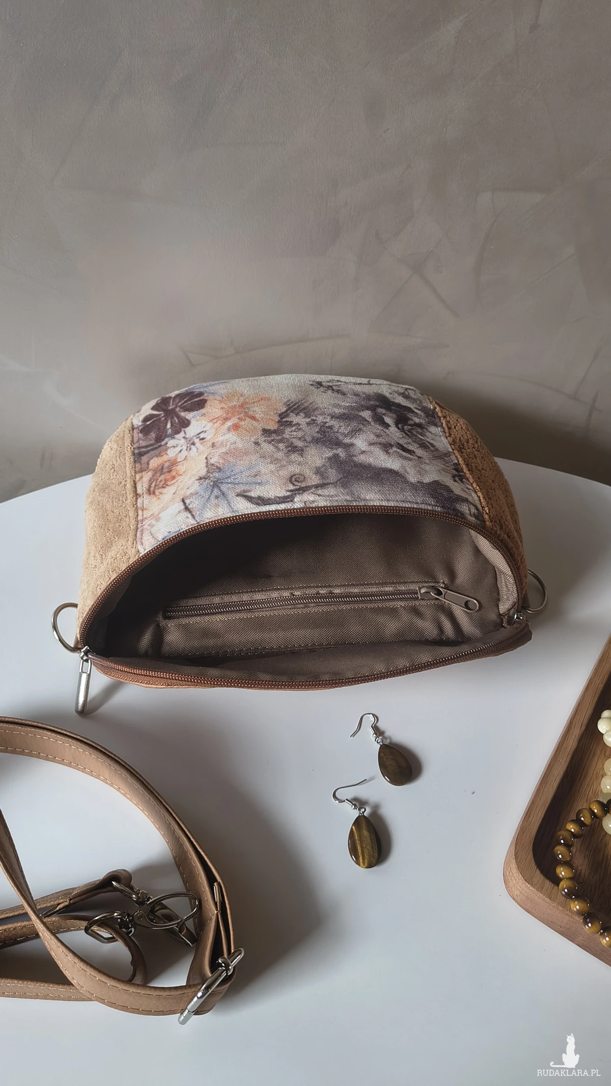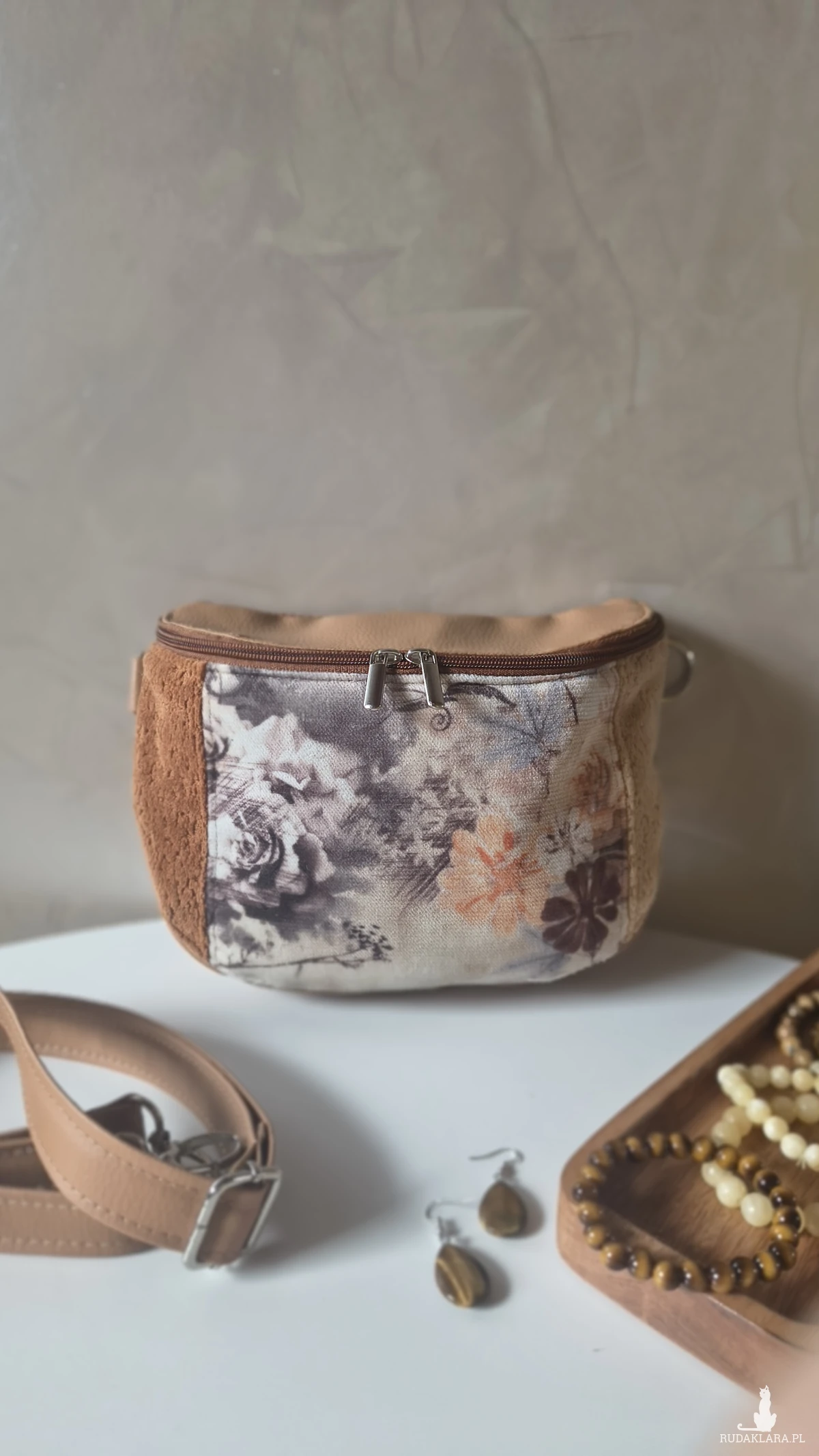 Torebka wykonana z materiałów tapicerskich i ekoskóry w odcieniach beżu i karmelu. Wewnątrz znajduje się wodoodporna, podszewka z kieszonką na zamek. Pasek wykonany z ekoskóry, regulowany. Okucia w kolorze srebrnym.