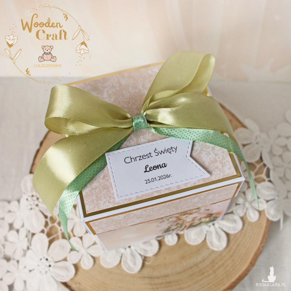 Przepiękna pamiątka chrztu świętego, roczku bądź narodzin, w formie exploding boxu utrzymanego w pięknych odcieniach brzoskwini, zgaszonej zieleni i bieli z dodatkiem złoych, błyszczących akcentów. Pudełeczko wykonane z mixu dziecięcych kolekcji papierów. Wieczko ozdobione zieloną kokardą oraz tagiem z imieniem dziecka i datą chrztu/narodzin/roczku - w zależności od okazji.