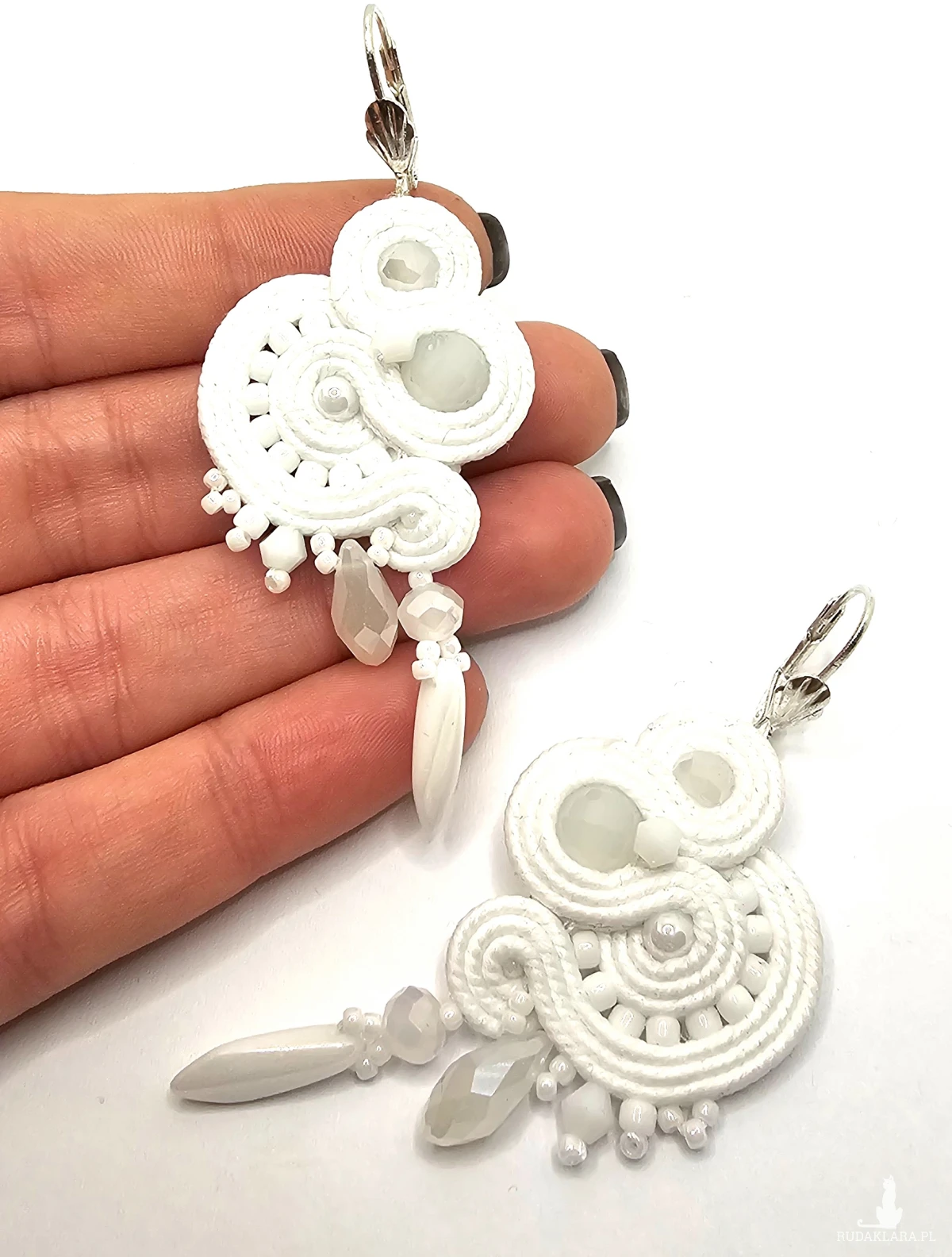 Białe szklane kulki otoczone polskimi sznurkami sutasz oraz szklanymi czeskimi i japońskimi koralikami o rożnych kształtach i wielkościach. Dół kolczyków zdobią szklane wiszące koraliki w kolorze perłowym oraz szklane kryształki. Kolczyki zawieszone na ozdobnych biglach angielskich w kolorze srebrnym.