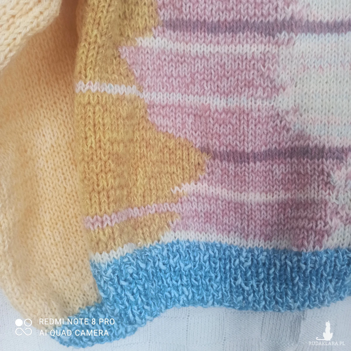 Sweter pod szyję płytkie karo, kolorowy oversize z długimi szerokimi rękawami. Bardzo lekki, wykonany ręcznie na drutach. Wykonany z nowej wełny i włóczki wielokolorowej, zastosowałam fantazyjne połączenia, czego efektem jest niepowtarzalność sweterka. Przód wielokolorowy, tył w odcieniu żółtego. Całość zamykają niebieskie pliski na dole w ściągaczu/1 na 1 oczko lewe i prawe/ sweterka i rękawach oraz na ramionach i przy szyi. Zastosowane karo przy dekolcie pozwala odkryć ramię. Całość wykonana oczkami prawymi. Jest miły w dotyku, nie drapie. Przewiewny , z tych dosyć krótkich, szeroki. Można nosić bez koszulki. Świetna propozycja dla nastolatek. Opadające ramiona przedłużają długość rękawa. Rękawy dosyć szerokie i długie. Wspaniały look do spódnicy i spodni, stanowi elegancką kompozycję. W rzeczywistości wygląda zdecydowanie lepiej. Pranie ręczne w kąpieli do 30 stopni.