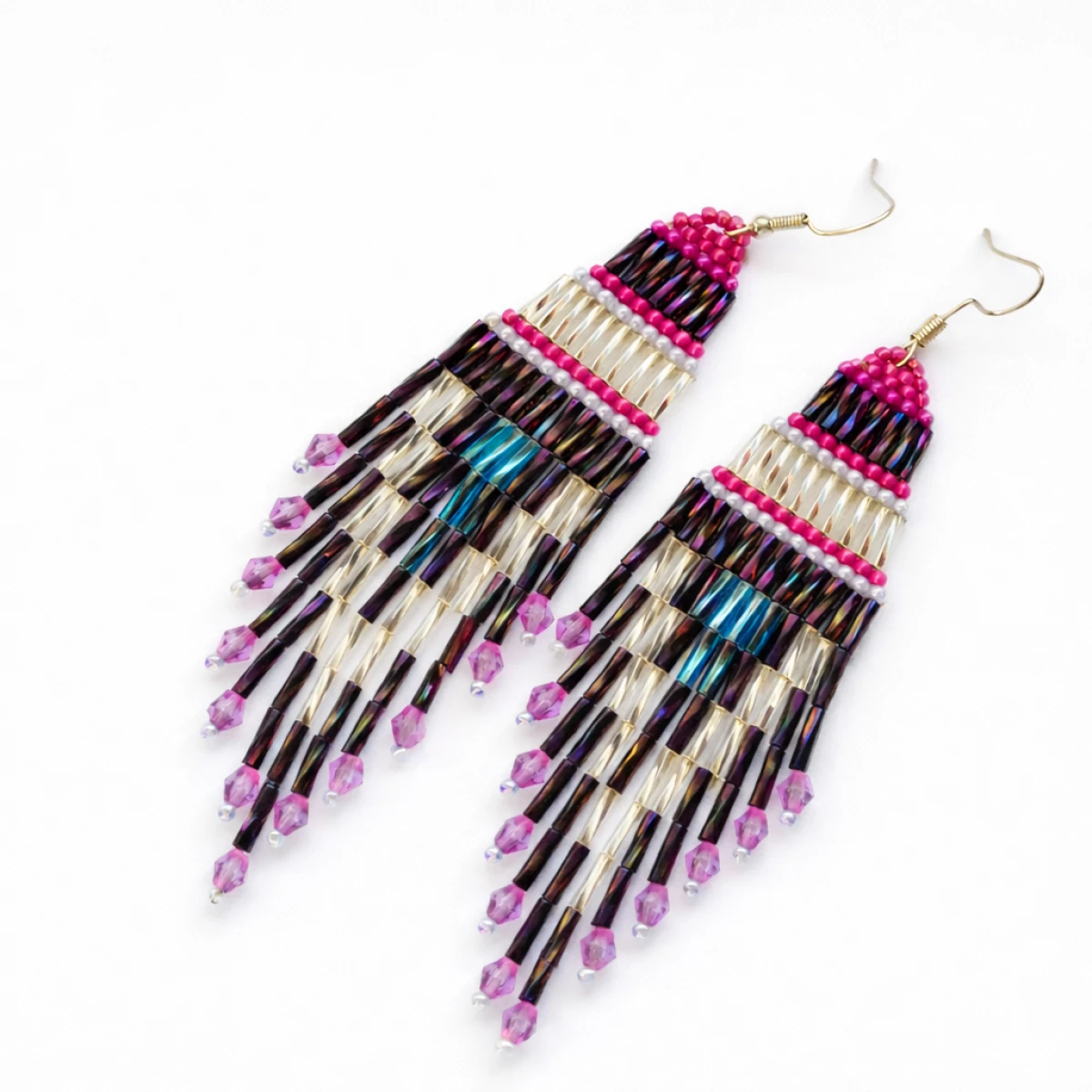 Kolczyki Ginger to ręcznie wykonana biżuteria z drobnych koralików, która zachwyca kontrastowym połączeniem srebrnych i czarnych elementów z subtelnym fioletem oraz akcentami błękitu i różu. Ich wachlarzowa forma i długie frędzle tworzą dynamiczny efekt, dzięki któremu kolczyki pięknie poruszają się w ruchu.