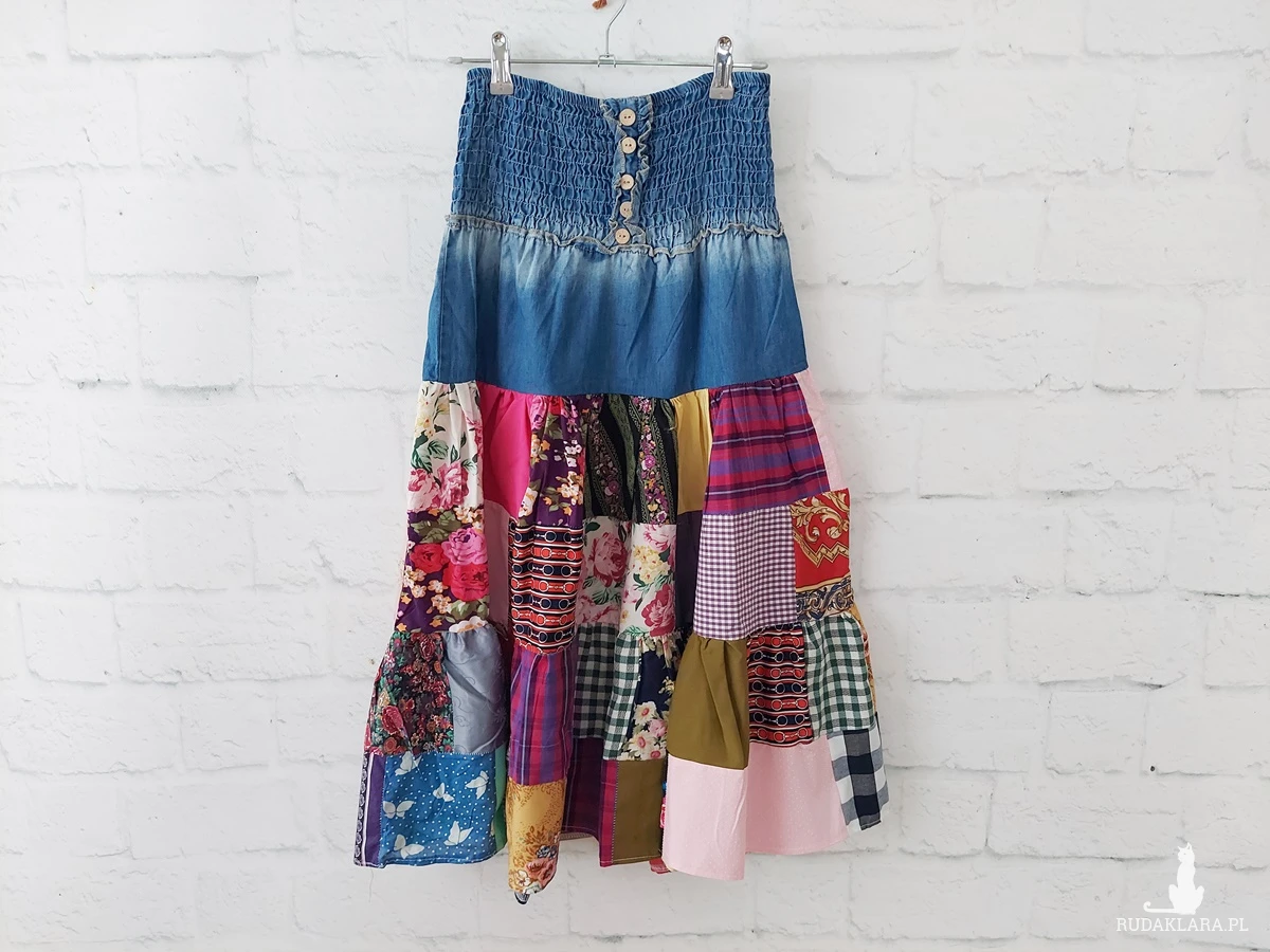 Spódnica z wysokim stanem, z rozciągliwą talią. Jest to prawdziwe patchworkowe dzieło, a nie materiał imitujący patchwork. Spódnica jest wykonana z dżinsu oraz wielu kawałków z pracowni krawieckiej – różnych tkanin o różnych wzorach, tworząc prawdziwy unikat, który nie ma sobie równych.