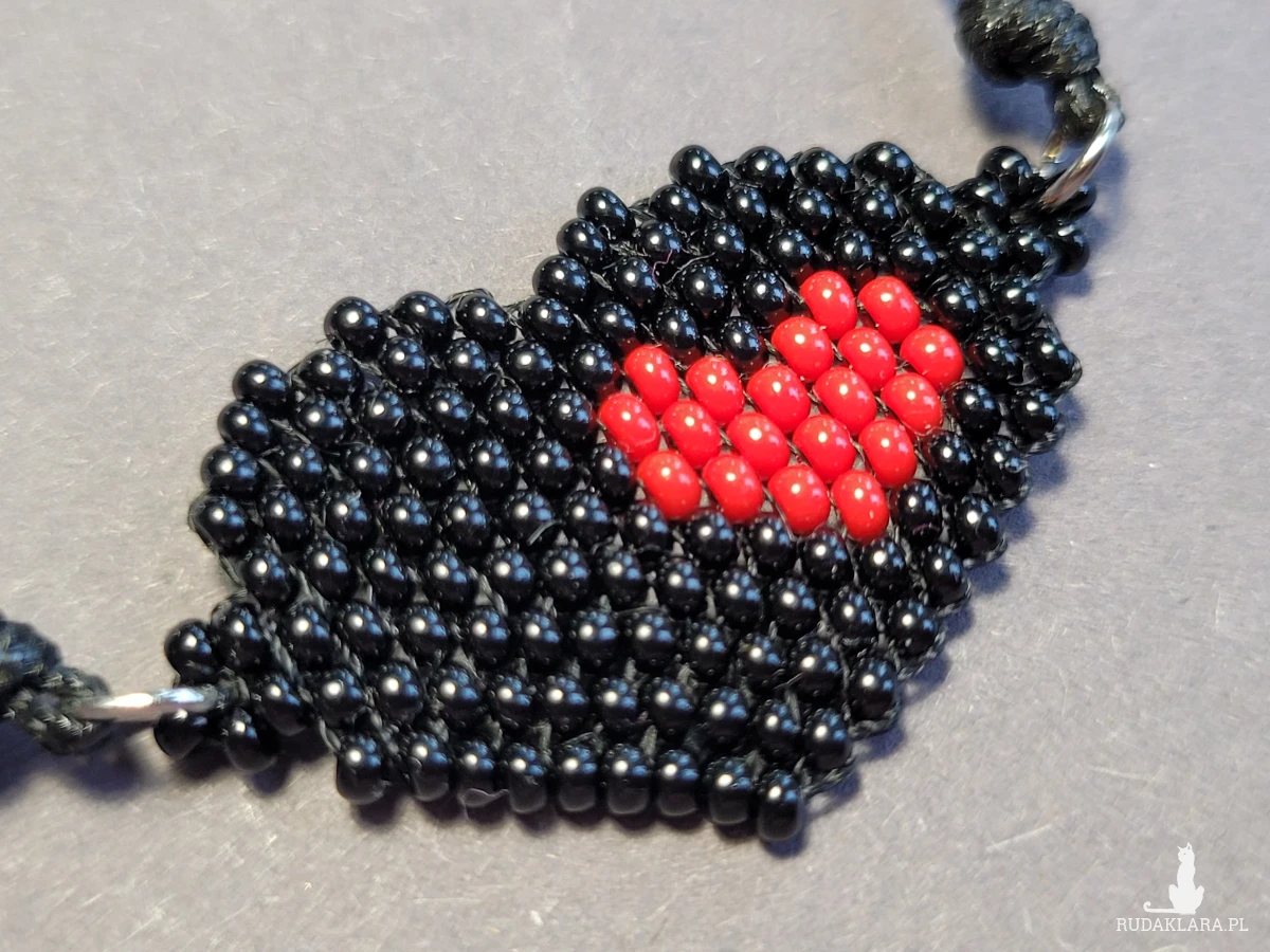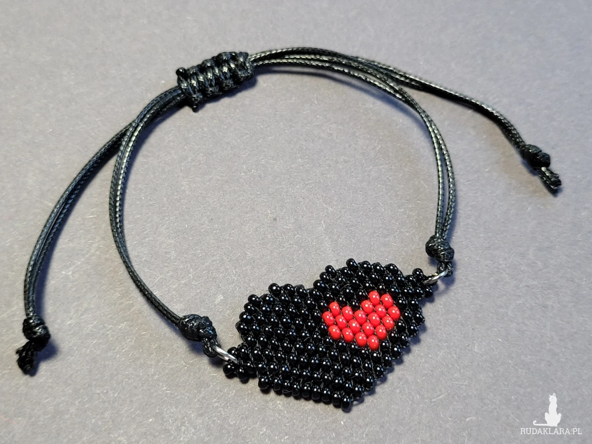 Bransoletka Miłość w sercu" czarno-czerwona zrobiona na sznurku z regulowanym zapięciem a element centralny został wytkany własnoręcznie z czeskich koralików Preciosa.