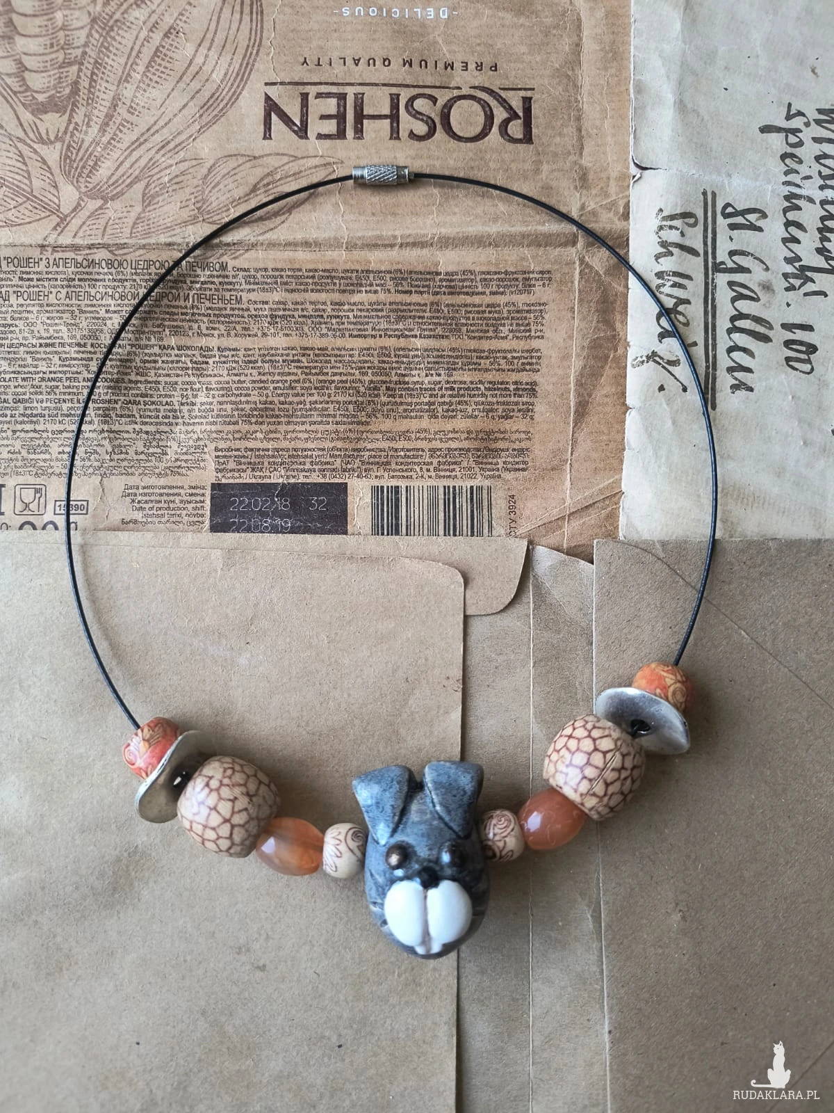 Naszyjnik ceramiczny na drucianej kolii z koralikiem w kształcie głowy świnki. Polecam serdecznie miłośnikom nietuzinkowej biżuterii.