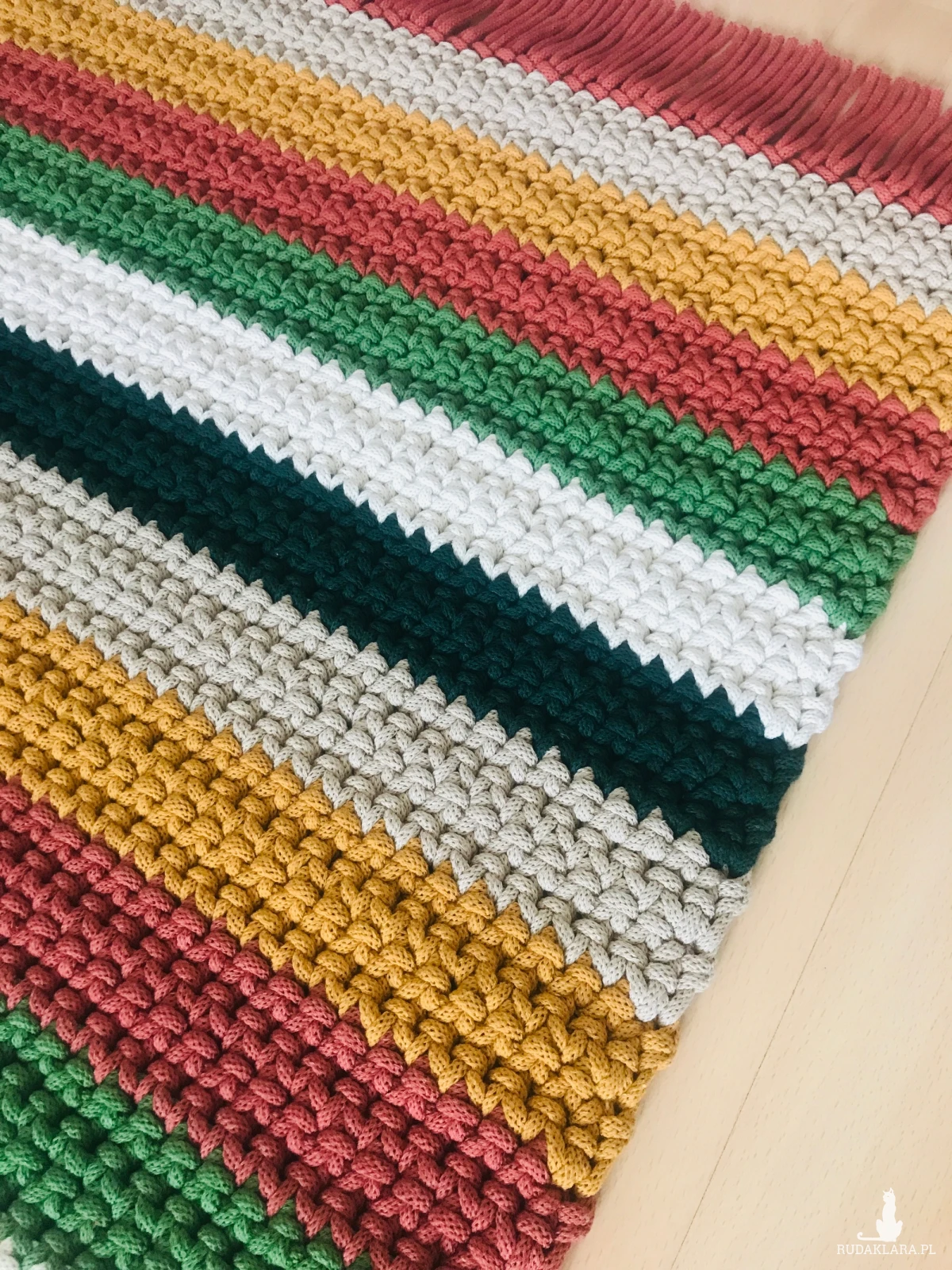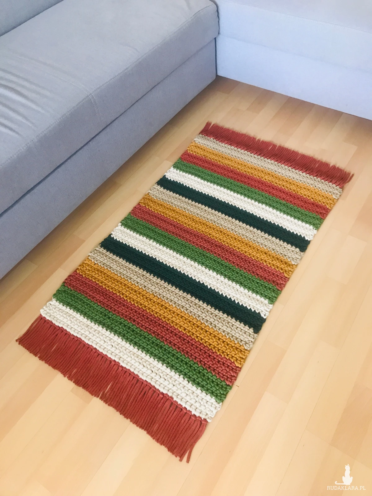 Dywan prostokątny w pasy dziergany na szydełku z polskiego sznurka bawełnianego o średnicy 5mm.