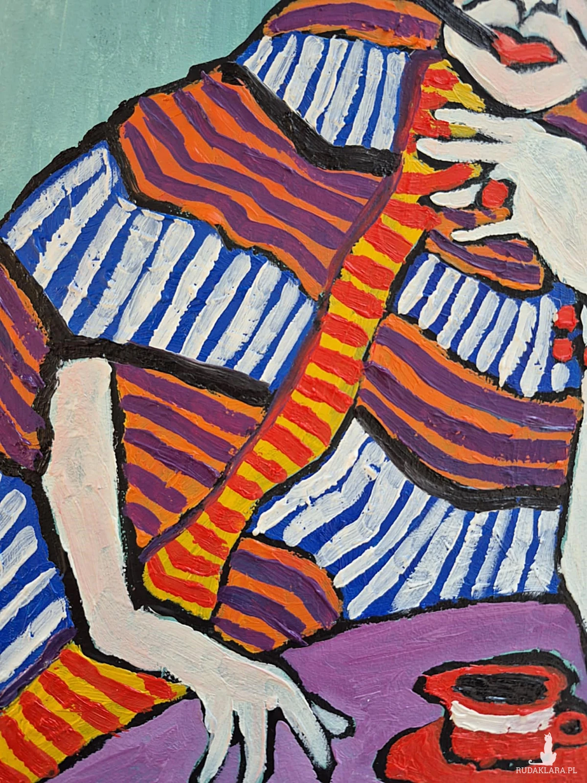 Na tym obrazie czas siedzi ciężko, jak dym unoszący się nad papierosem. Kobieta leży w półgeście, jakby świat na chwilę stracił ostrość, a ona pozwoliła sobie w nim rozmyć. Jej ciało nie jest ciałem — jest rytmem. Pasma kolorów oplatają ją jak myśli: powtarzalne, natarczywe, czasem sprzeczne. Pomarańcz pulsuje, fiolet drży, biel próbuje uspokoić chaos.