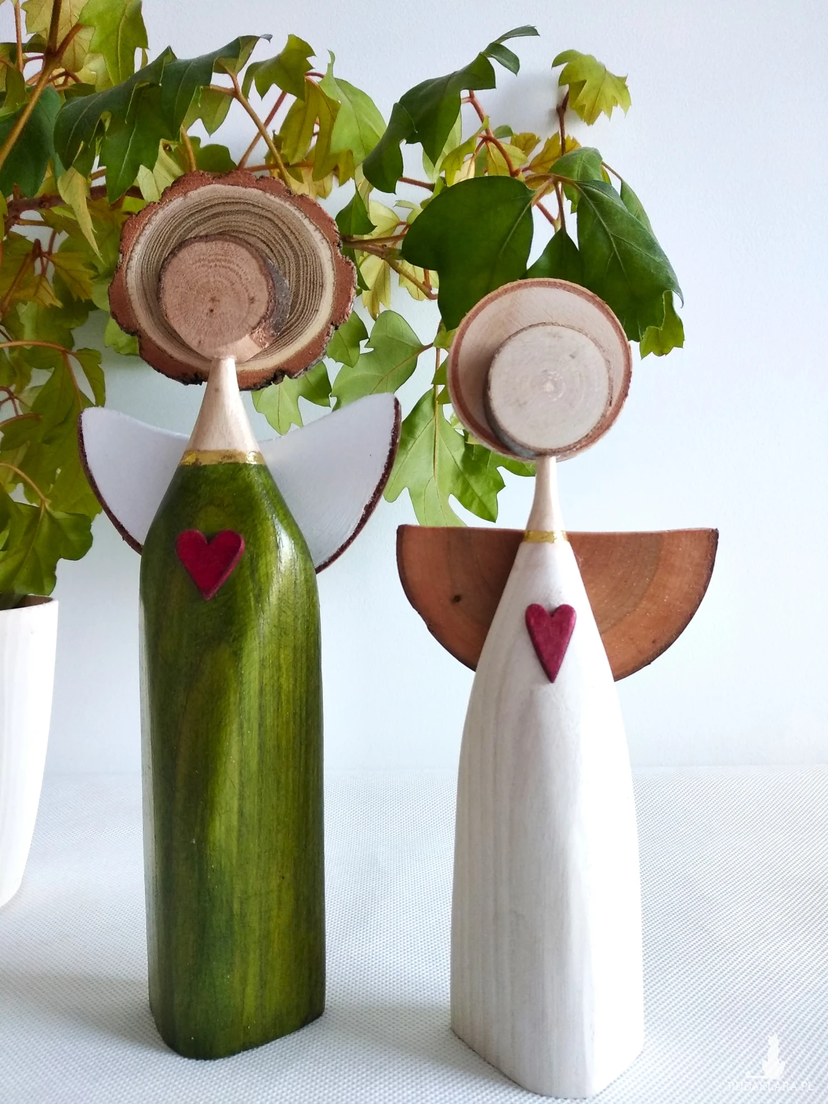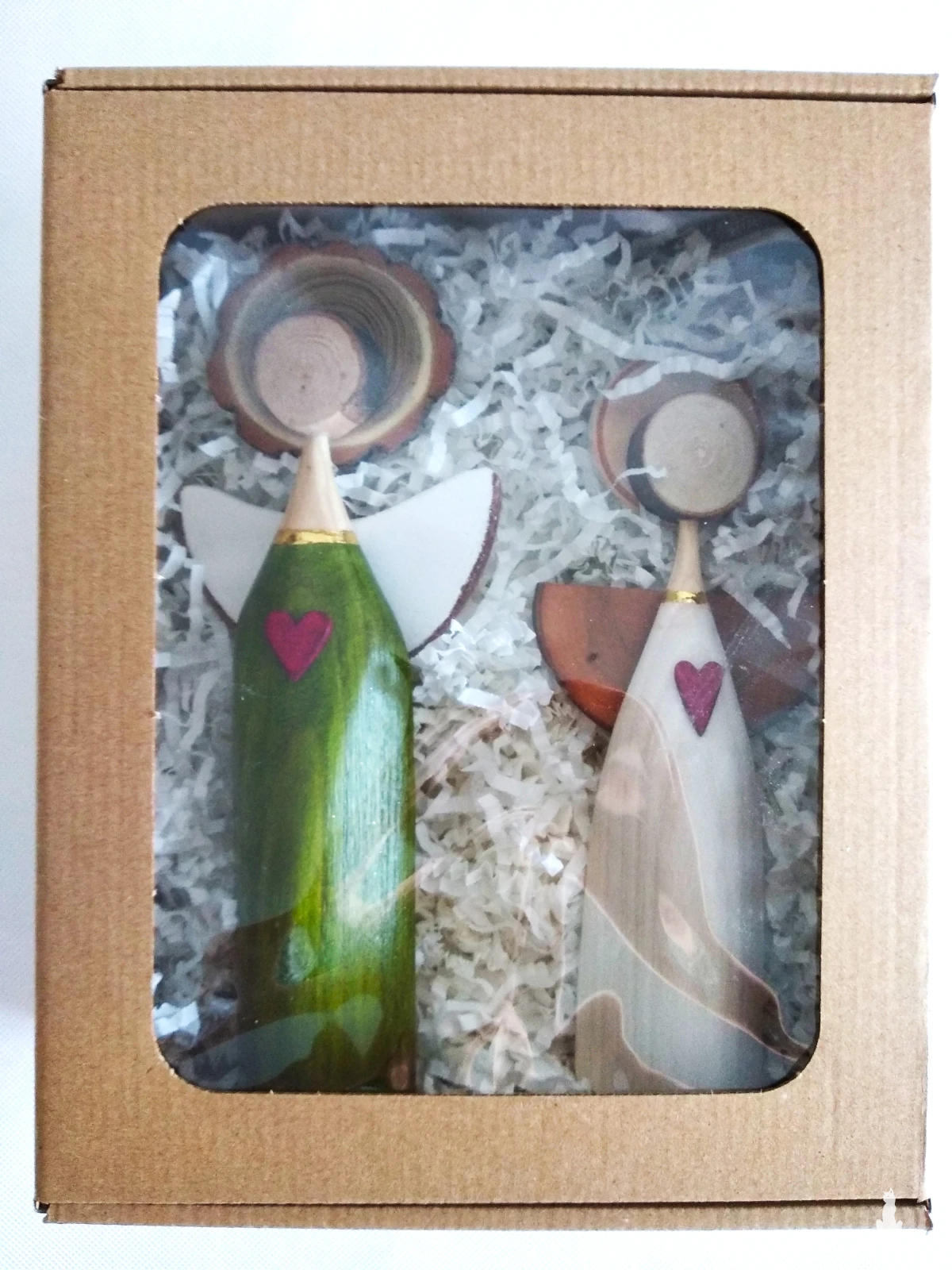 Aniołki wykonane z drewna bukowego. Biały malowany farbą akrylową, zielony barwiony bejcą wodną i zabezpieczone bezbarwnym akrylowym lakierem. Ten zestaw doskonale odnajdzie się jako prezent dla miłośników aniołów i rękodzieła, ale też jako symboliczny upominek z okazji ważnych chwil – ślubu, rocznicy, parapetówki czy po prostu jako gest bliskości bez szczególnej okazji.