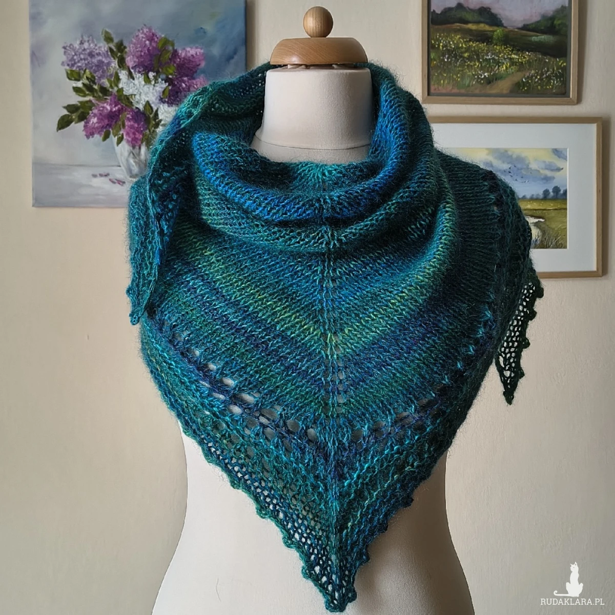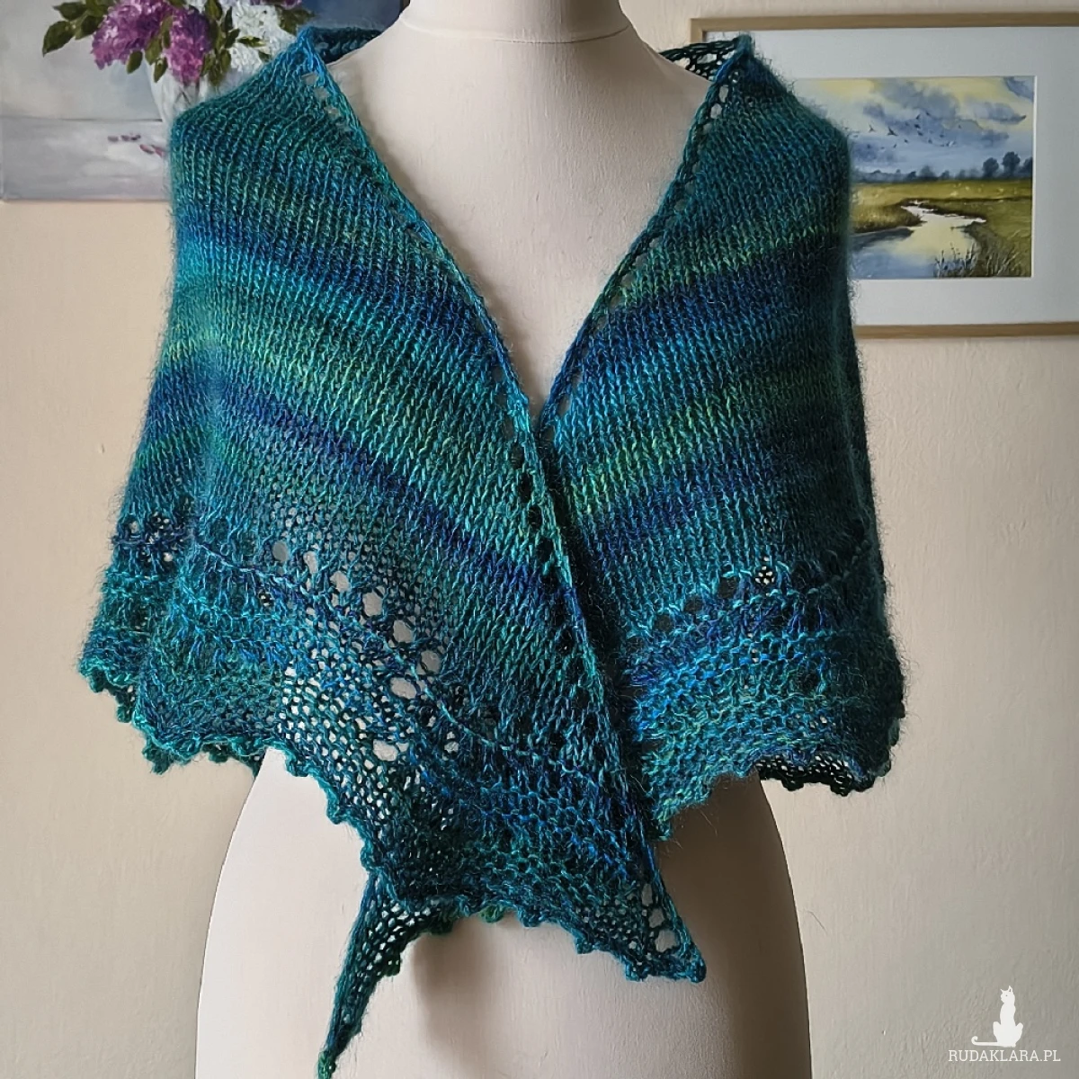 Cudownie miękka, lejąca, delikatnie puchata chusta wykonana ręcznie na drutach podwójną nitką z najwyższej jakości włóczek: niezwykle delikatnego, miękkiego kanadyjskiego moheru z jedwabiem (70%/30%) i australijskiej włóczki o składzie: wełenka merino, wełna i niewielka ilość akrylu. Kombinacja włóczek dała cudny efekt kolorystyczny, o wiele ciekawszy w rzeczywistości, ponieważ zdjęcia nie oddają wszystkich niuansów kolorystycznych. Chusta jest ciepła, a przy tym lekka. Pięknie się układa. Doskonały dodatek do różnych stylizacji o każdej porze roku.. Wymiary: 172 cm. bok najdłuższy, 70 cm. wysokość trójkąta. Pranie wyłącznie ręczne.