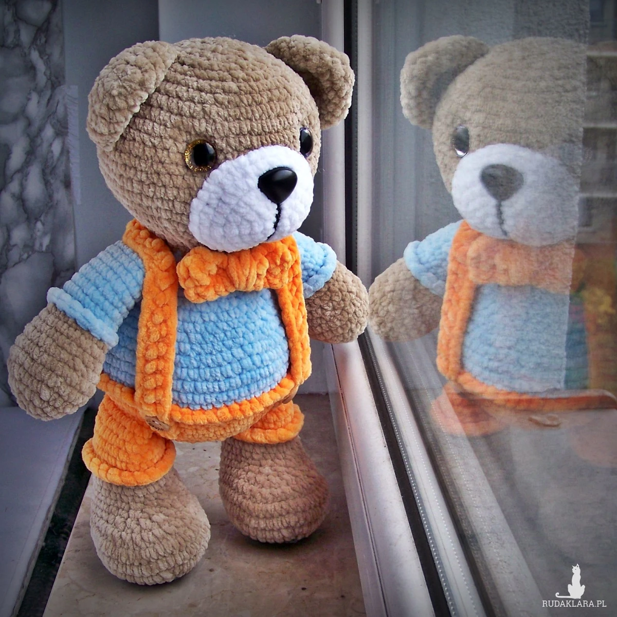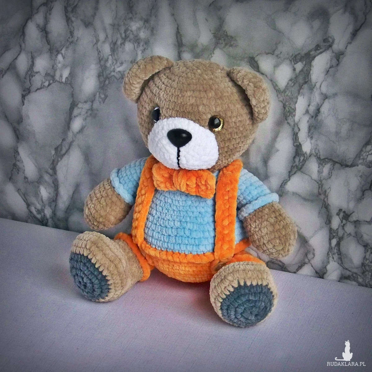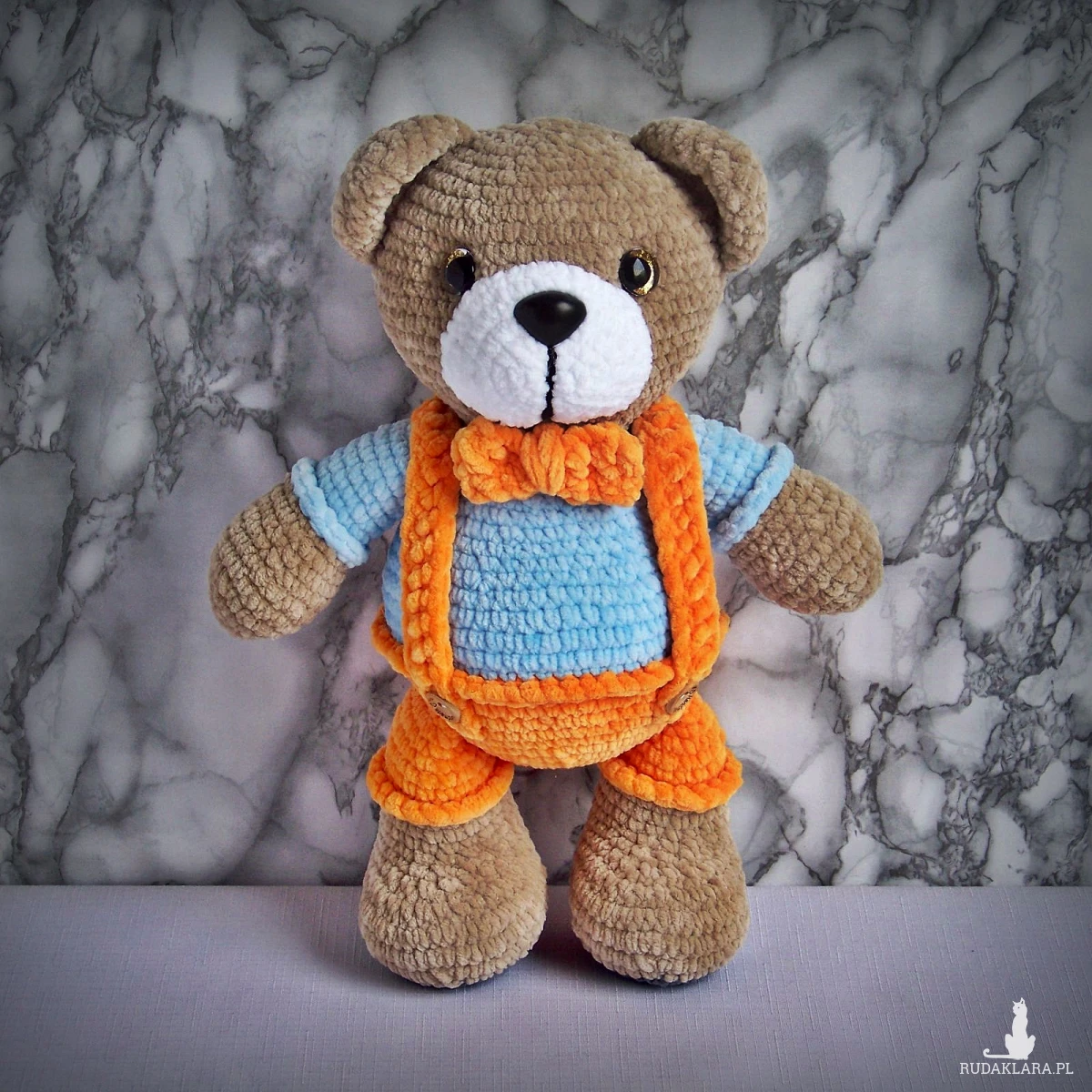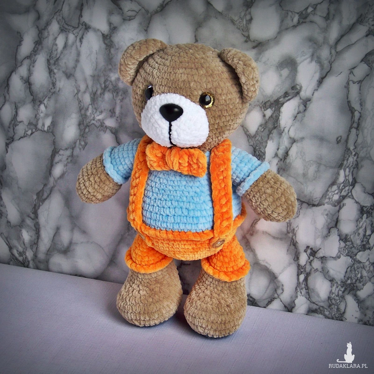 Szydełkowy miś 32cm w pomarańczowych spodenkach (na zamówienie)