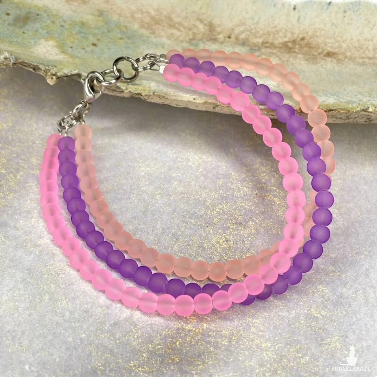 Bransoletka z matowych koralików to efektowny dodatek, który ożywia stylizację wyrazistą paletą barw. Każdy sznur szklanych koralików ma inny odcień, dzięki czemu całość nabiera głębi i wielowymiarowości. Matowe wykończenie dodaje jej delikatności, a srebrzyste elementy wprowadzają nowoczesny charakter. To dodatek, który wnosi lekkość i świeżość niezależnie od sezonu, idealny na co dzień i na bardziej swobodne okazje. Całość uzupełnia praktyczny karabińczyk, gwarantujący komfortowe użytkowanie.