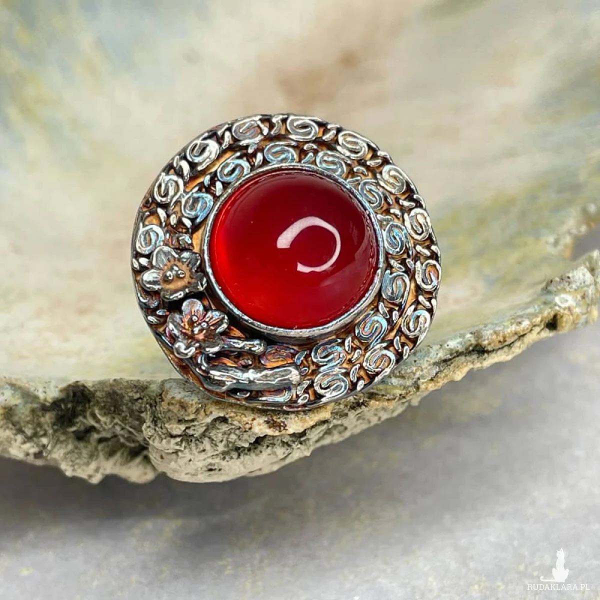 Intensywna czerwień agatu przykuwa uwagę jak świetlista kropla zatopiona w bogato zdobionej, srebrnej oprawie. Delikatnie oksydowane elementy nadają pierścionkowi głębi i artystycznego wyrazu, subtelnie balansując między klasyczną elegancją a rzemieślniczym kunsztem. Ręczne wykonanie sprawia, że każda sztuka ma niepowtarzalny charakter i ponadczasowy wdzięk. To biżuteria dla kobiet poszukujących dodatków z charakterem - wyrazistych, a zarazem pełnych klasy i subtelności.
