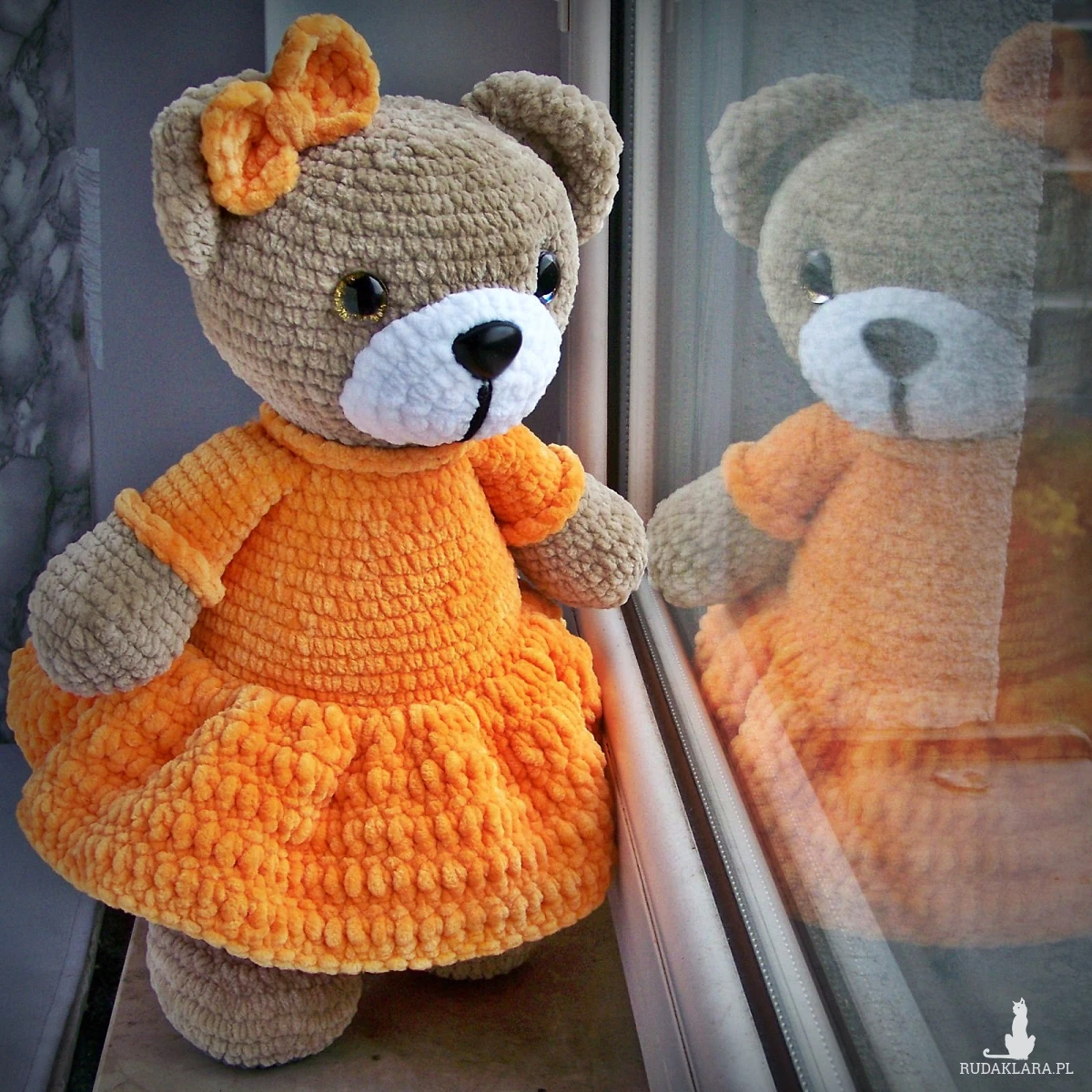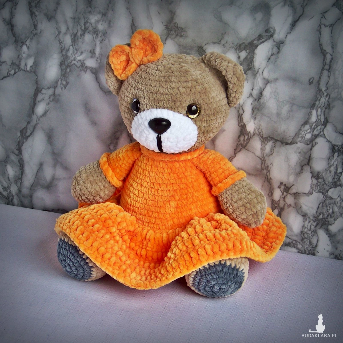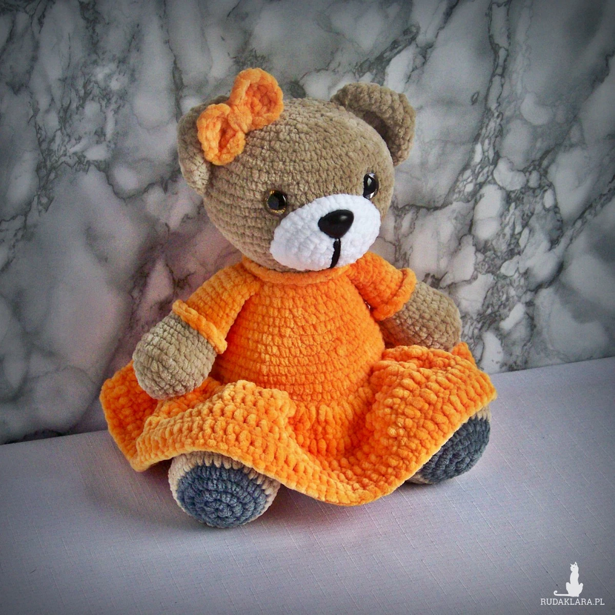 Szydełkowy miś 32cm w ciemnożółtej sukience (na zamówienie)
