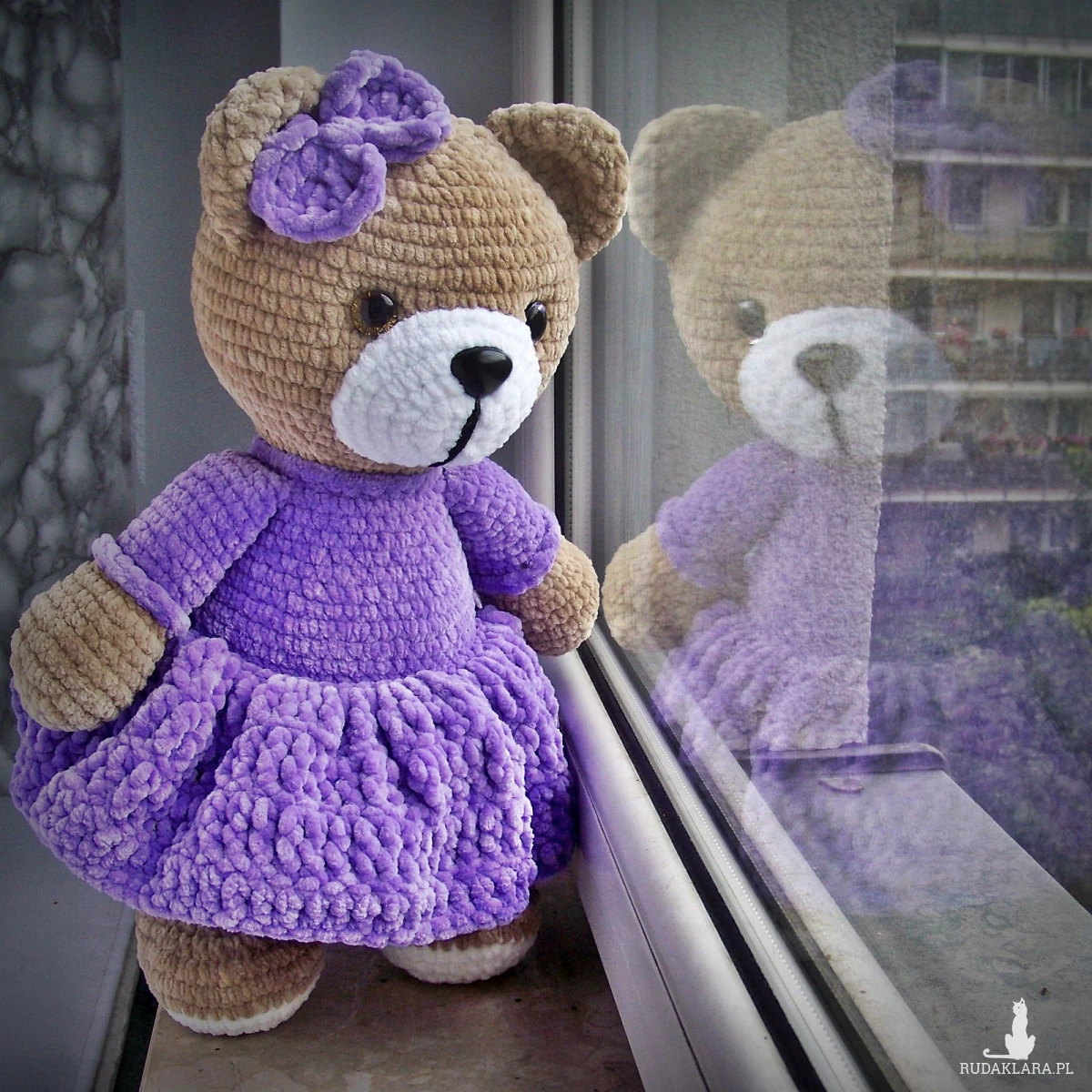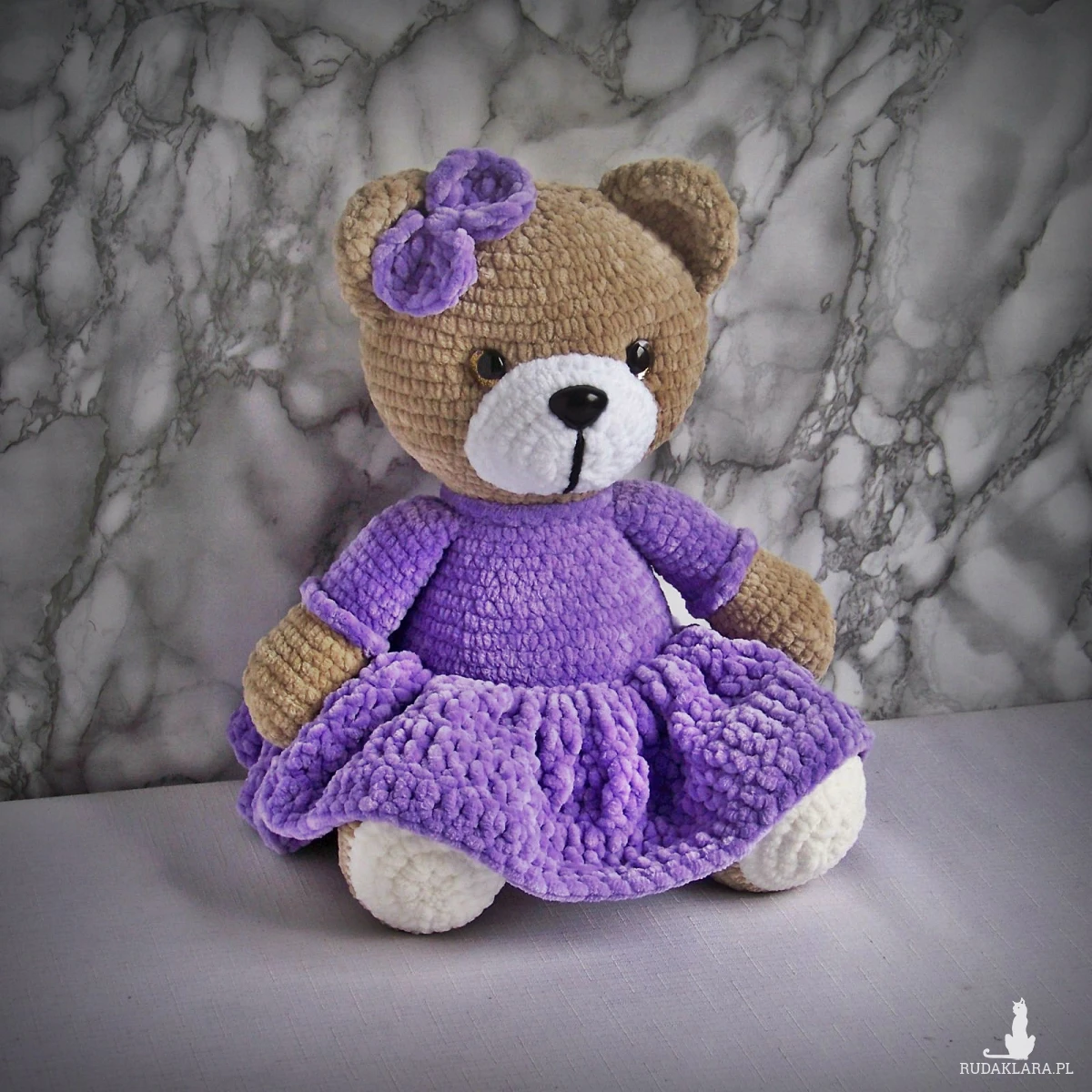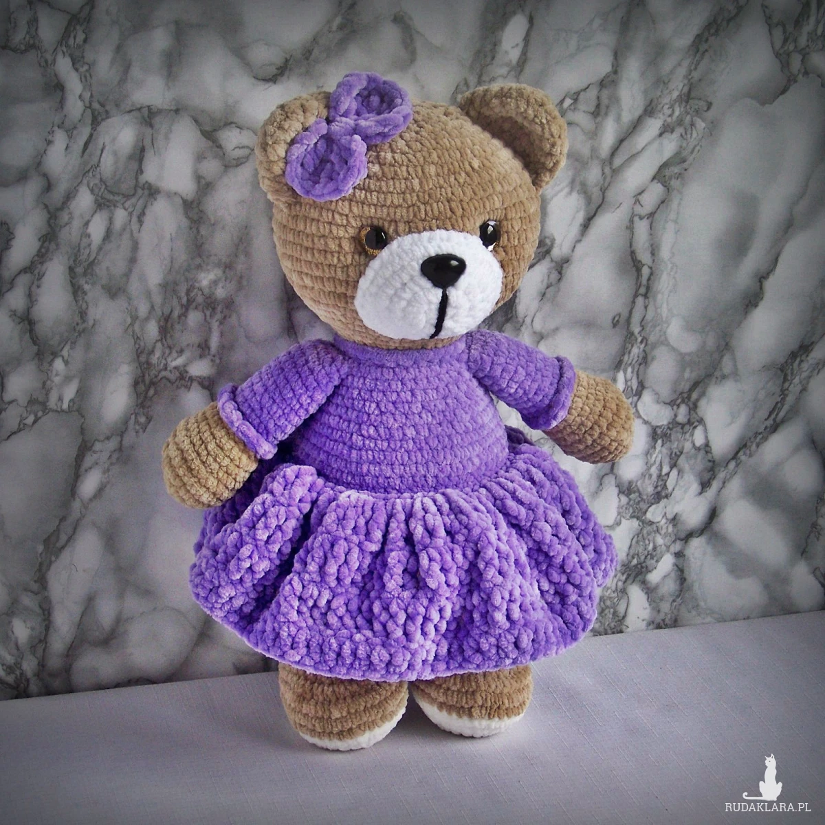 Szydełkowy miś 32cm w fioletowej sukience (na zamówienie)