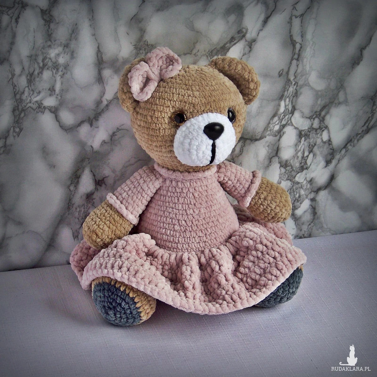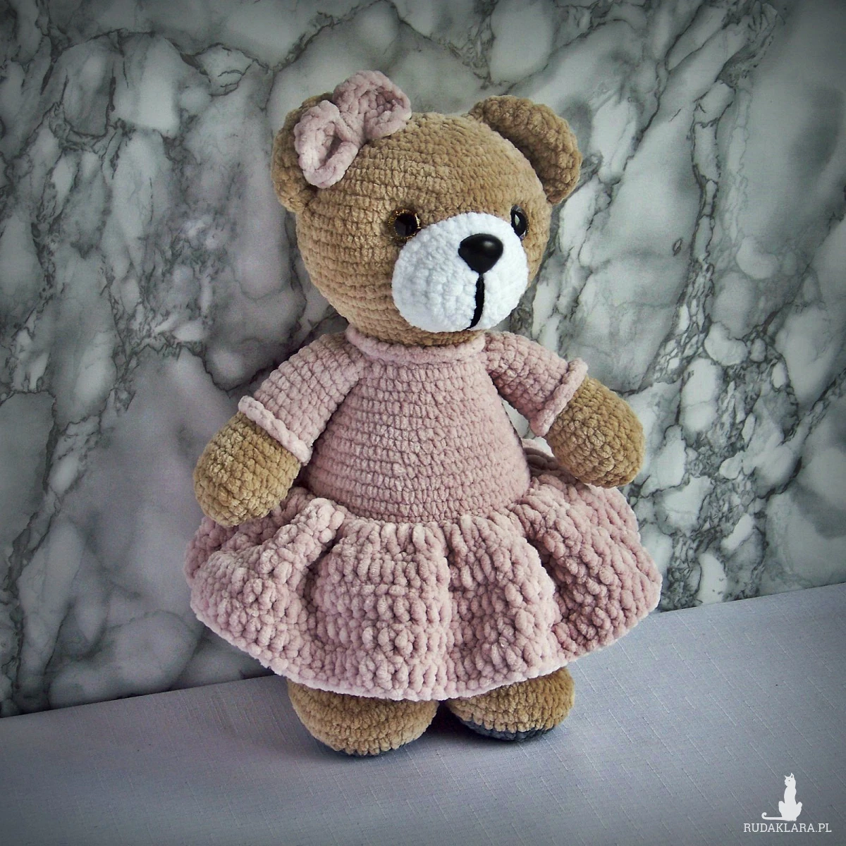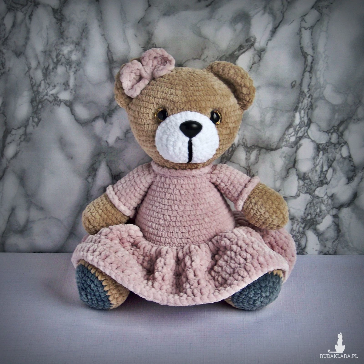 Szydełkowy miś 32cm w sukience pudrowy róż (na zamówienie)