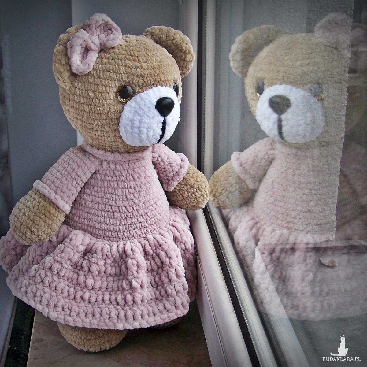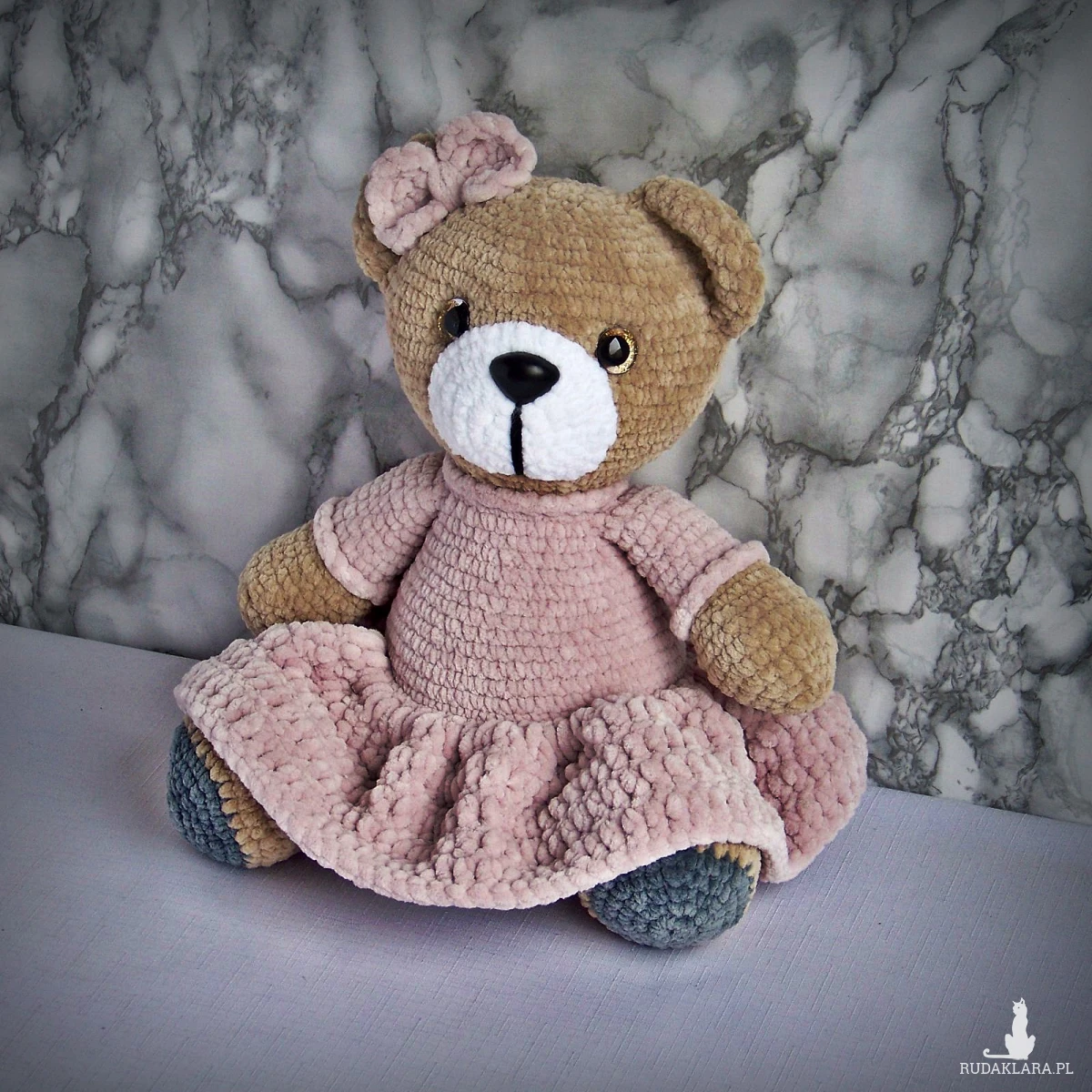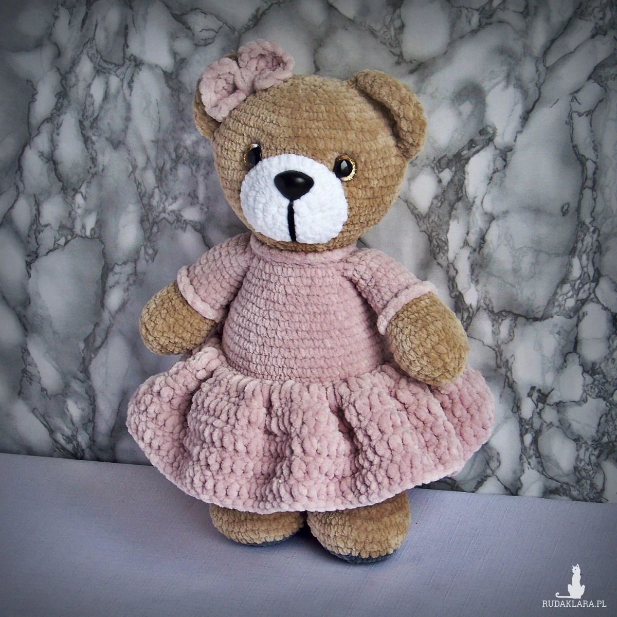 Szydełkowy miś 32cm w sukience pudrowy róż (na zamówienie)