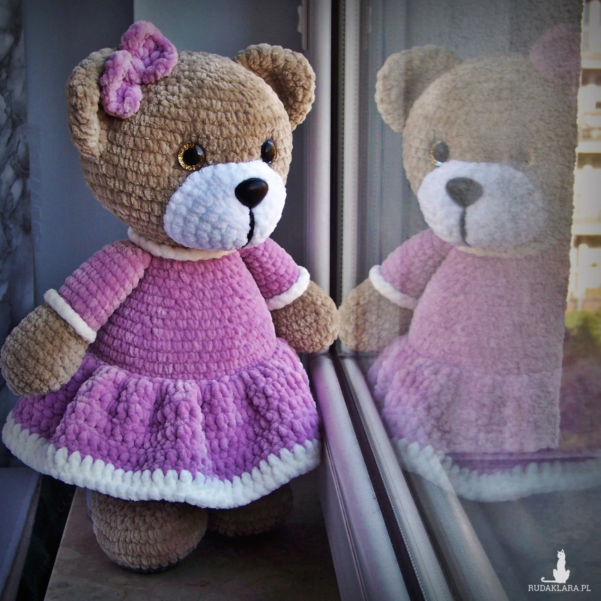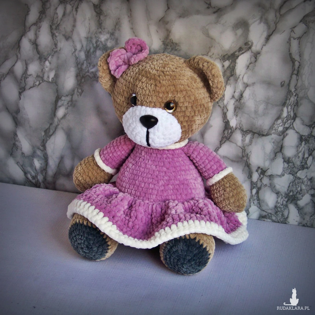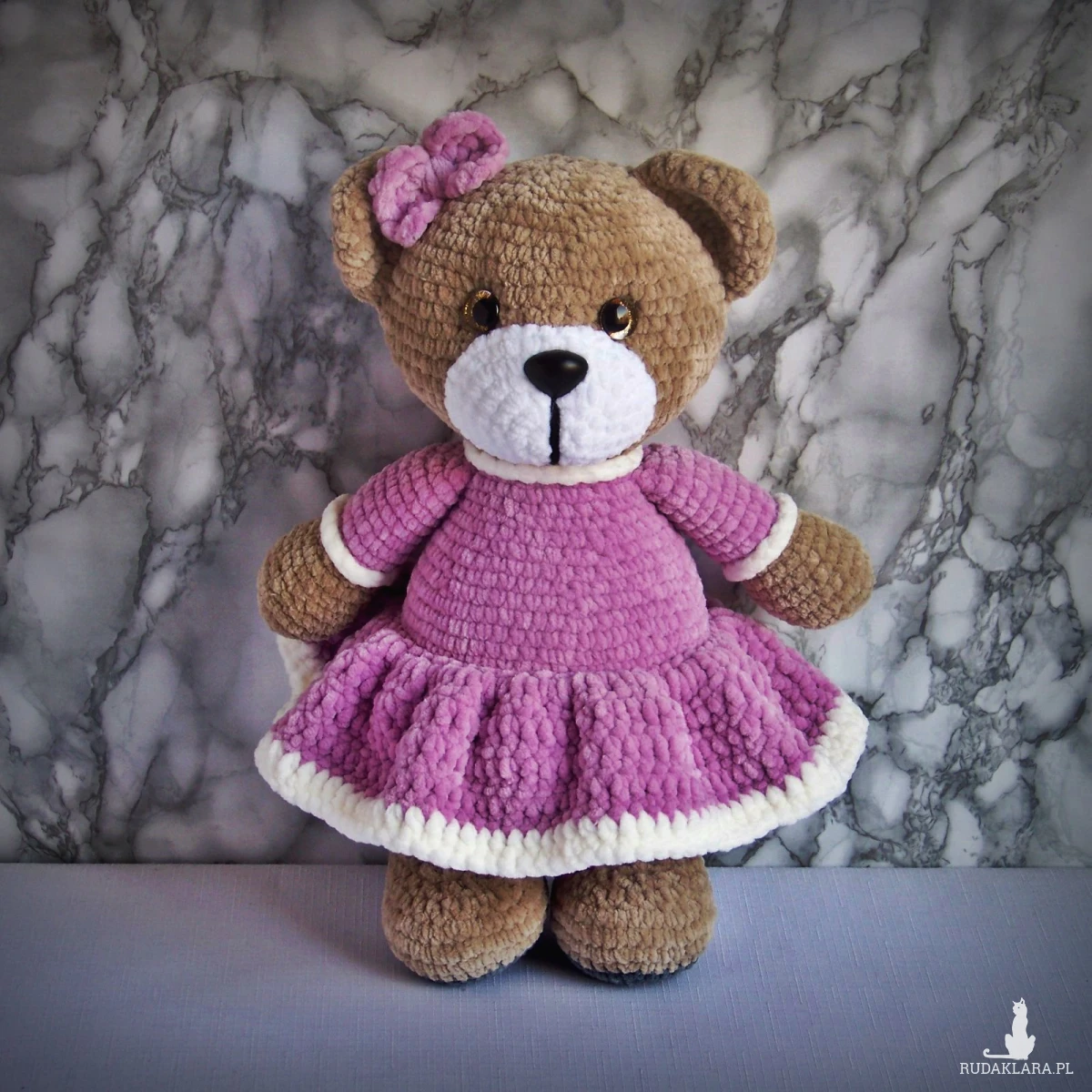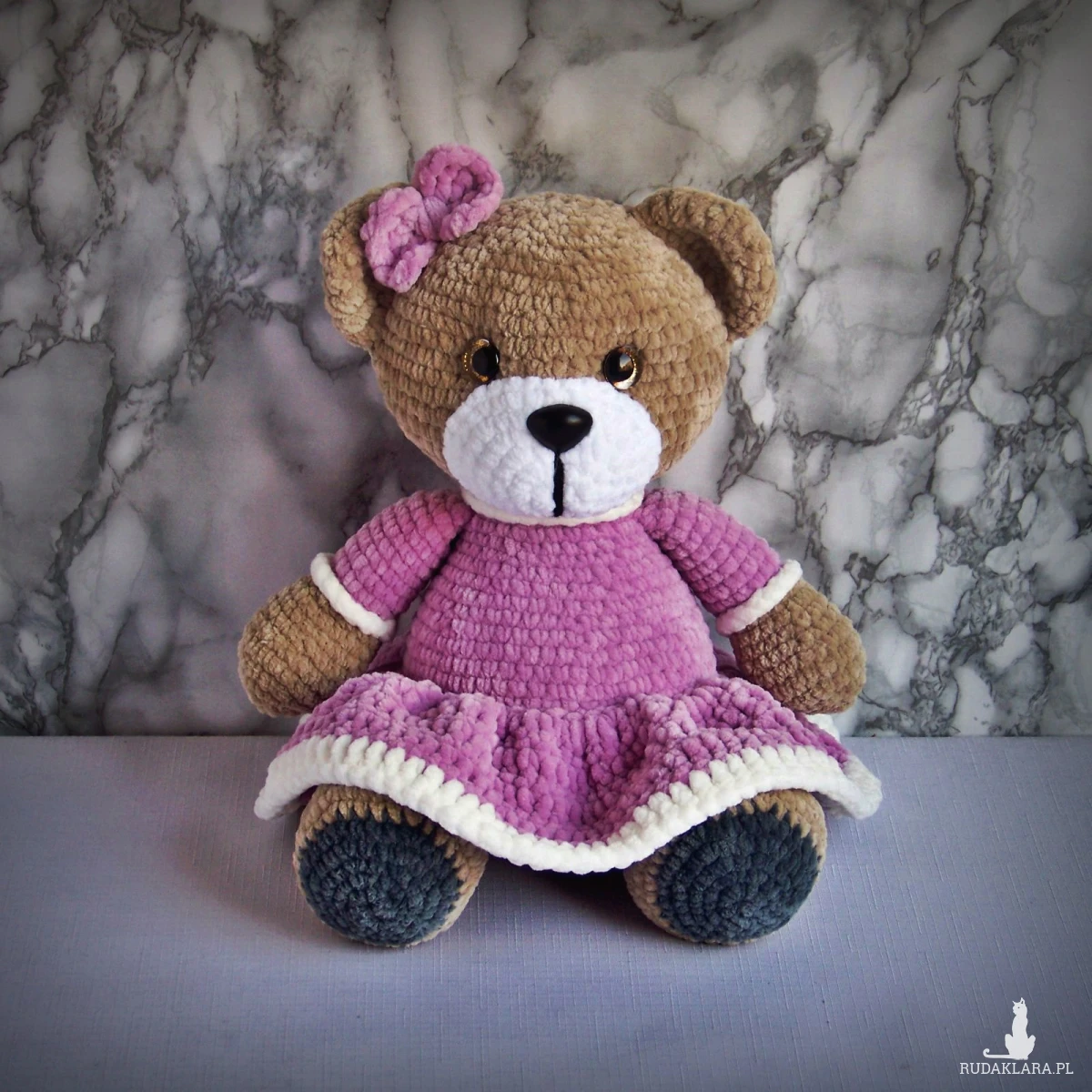 Szydełkowy miś 32cm we wrzosowej sukience (na zamówienie)
