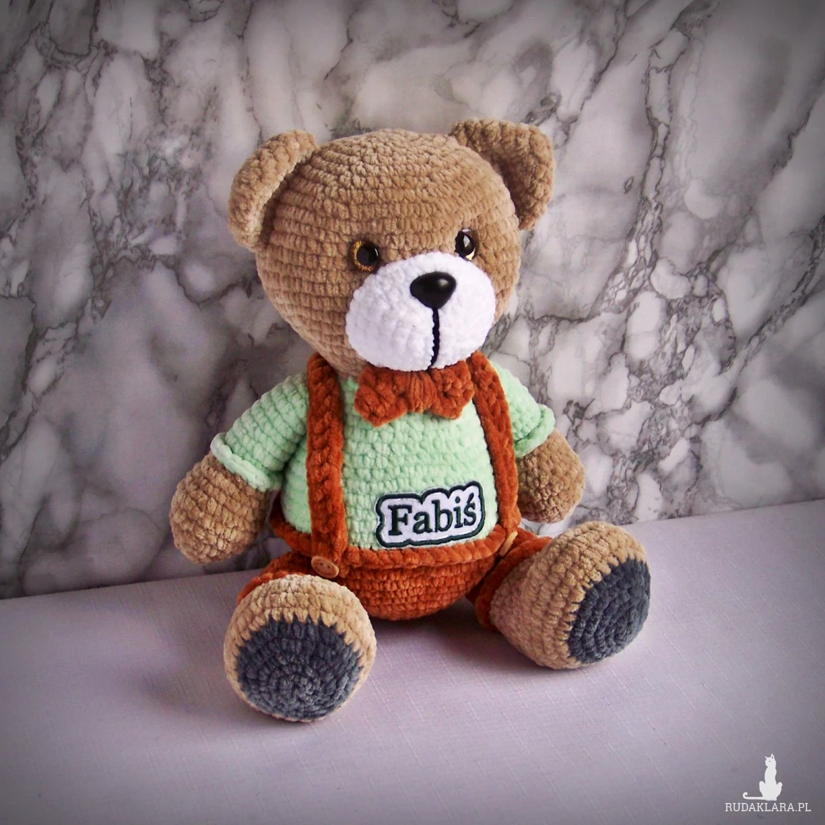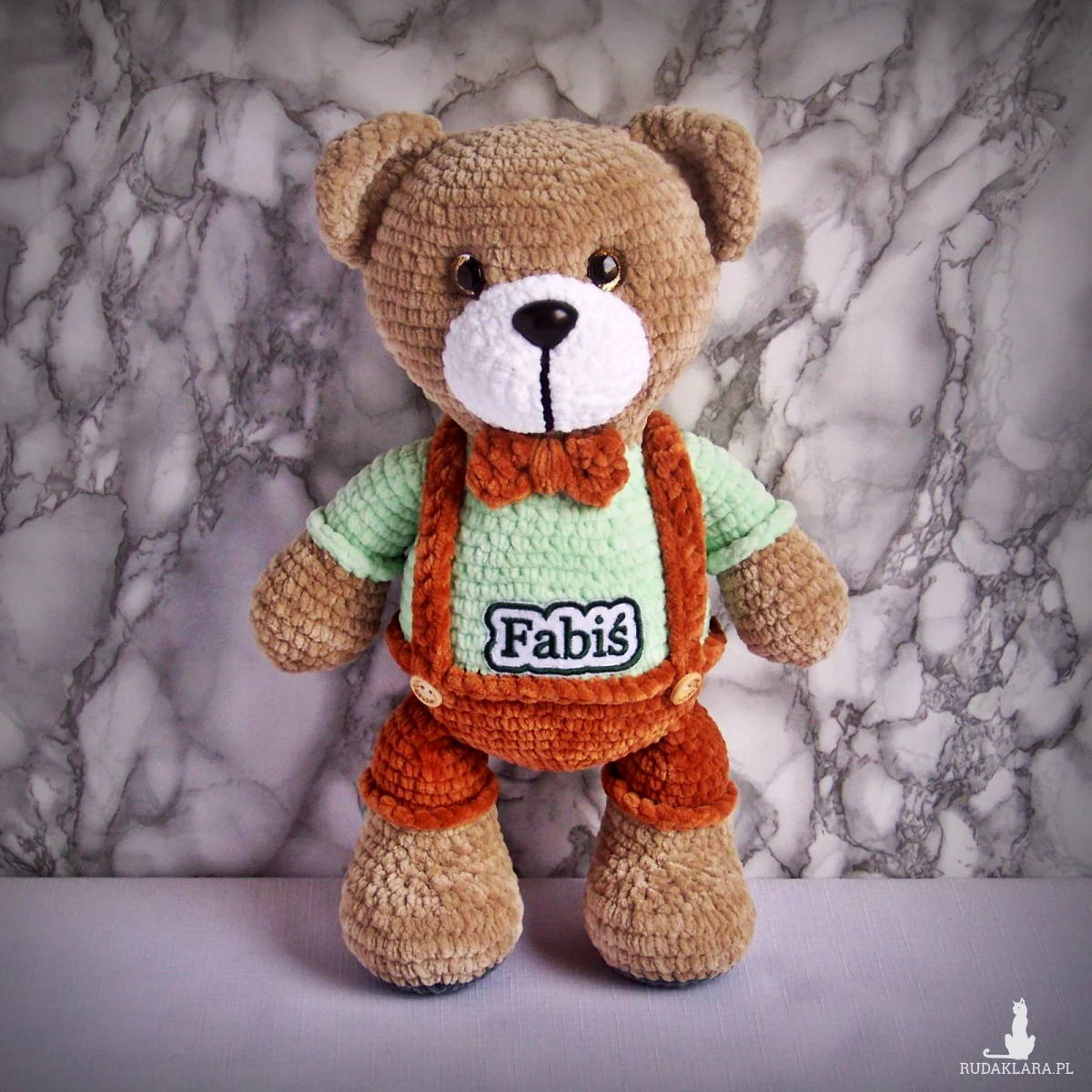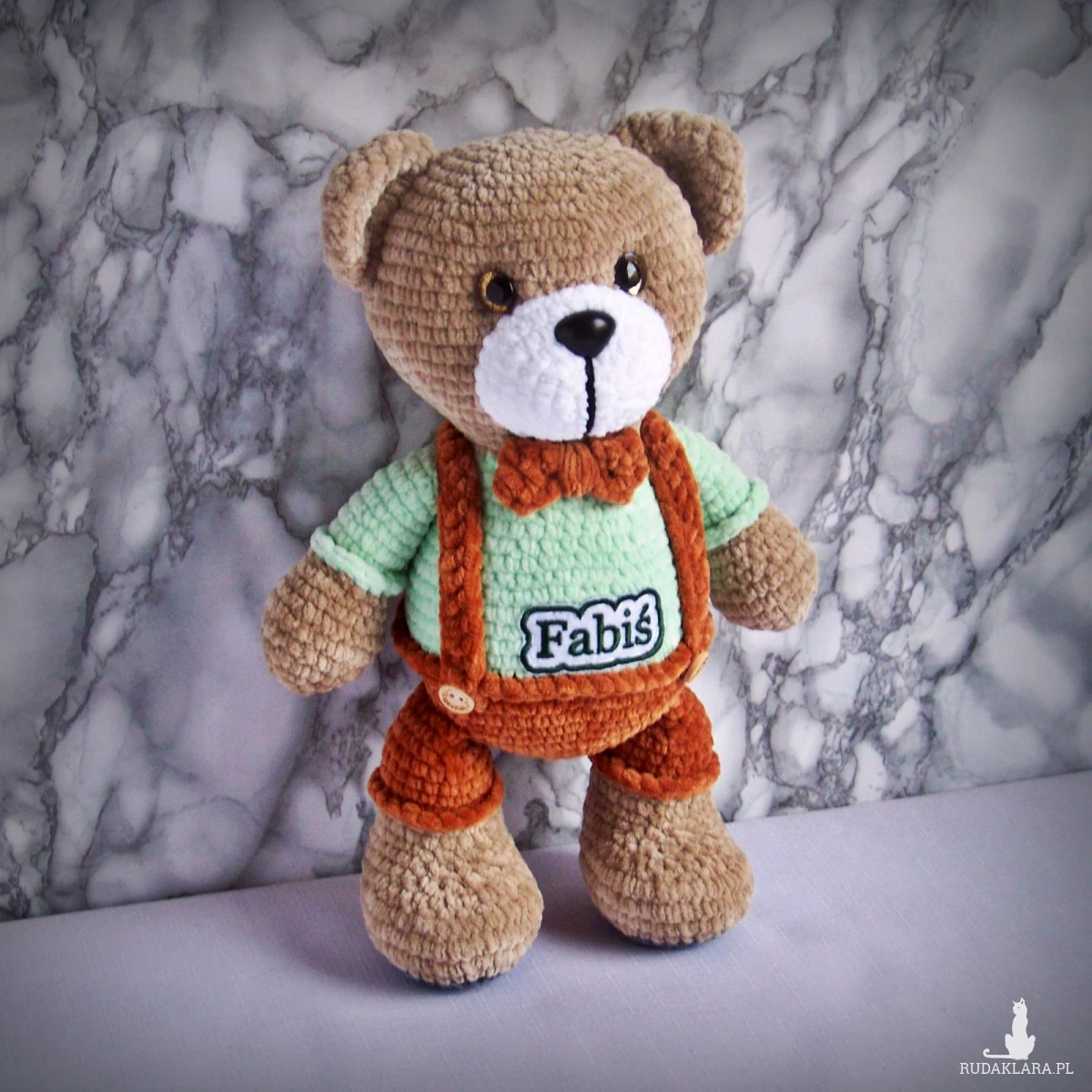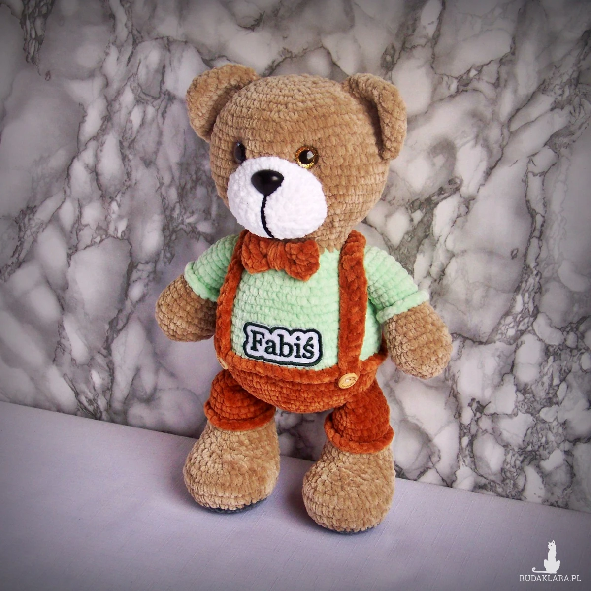 Szydełkowy miś Fabiś 32cm w brązowych spodenkach (na zamówienie)