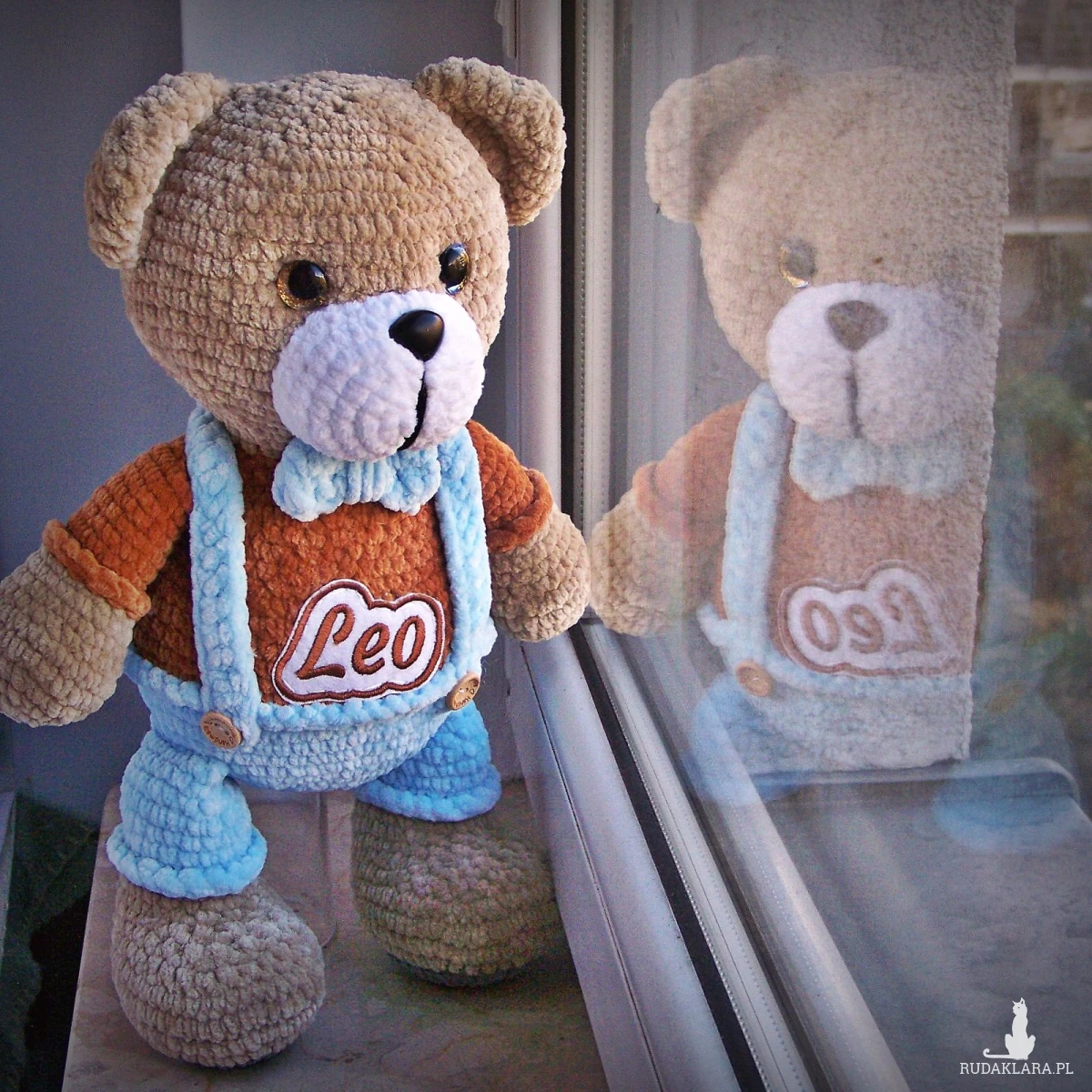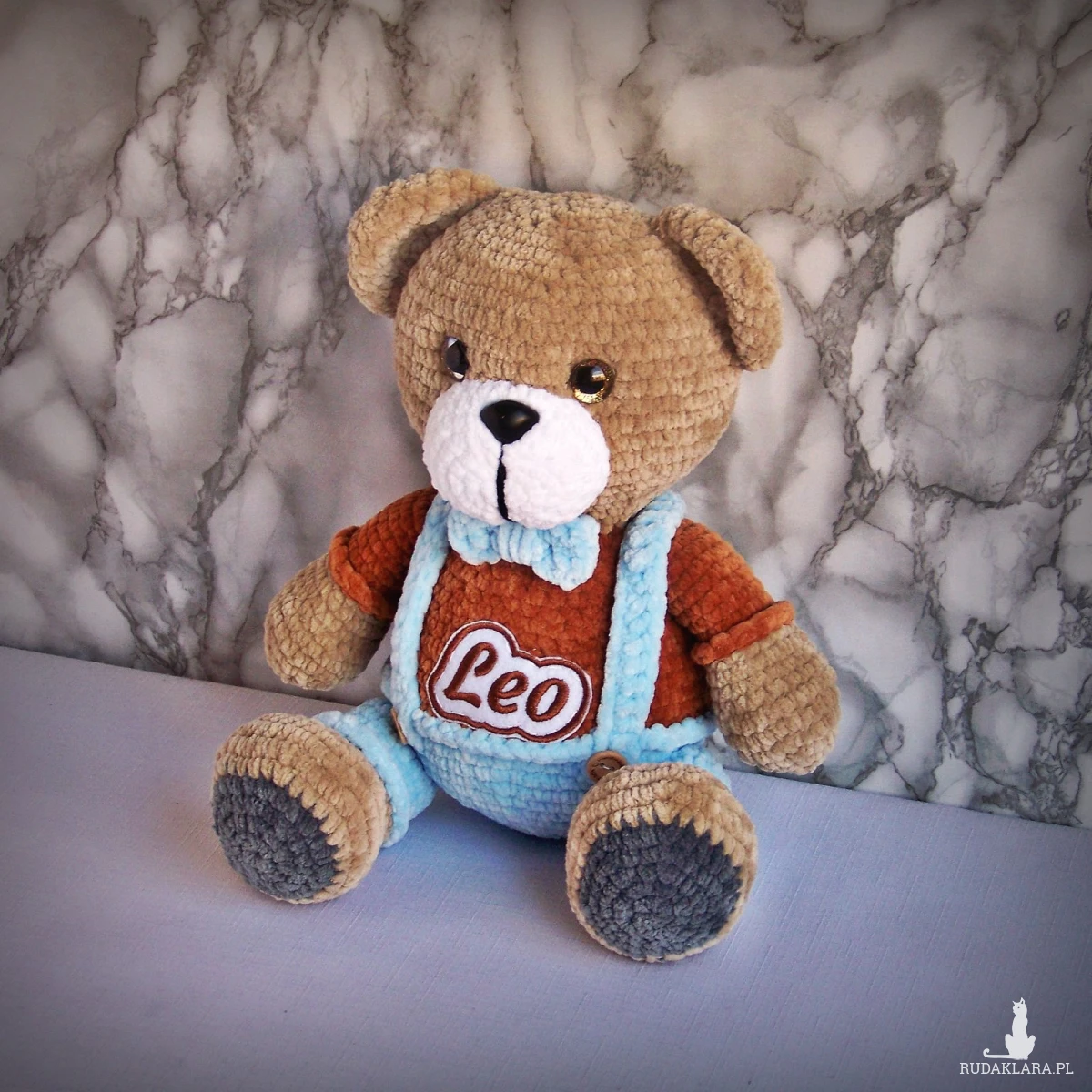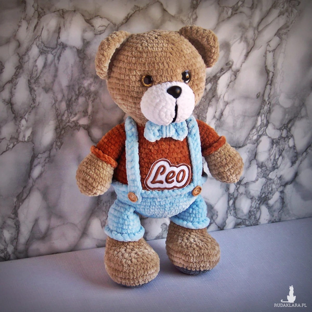 Szydełkowy miś Leo 32cm w niebieskich spodenkach (na zamówienie)