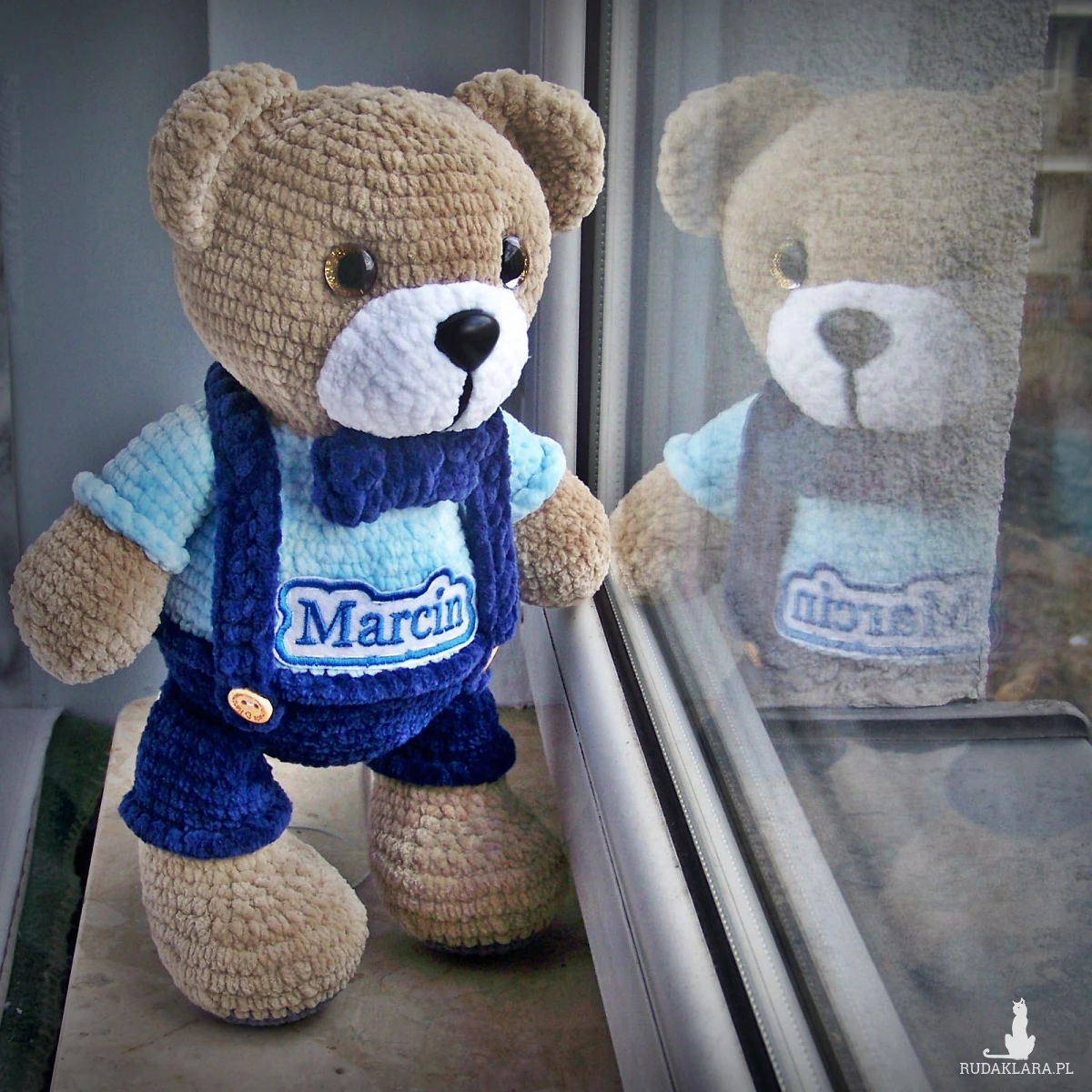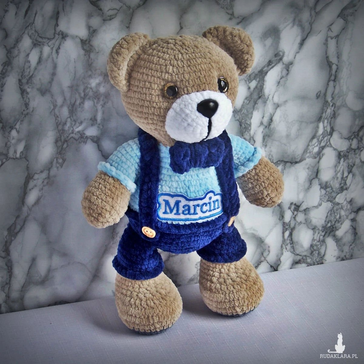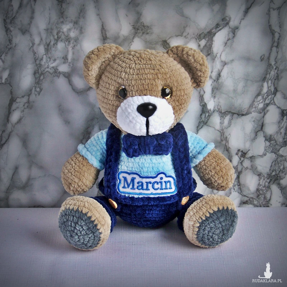 Szydełkowy miś Marcin 32cm w granatowych spodenkach (na zamówienie)