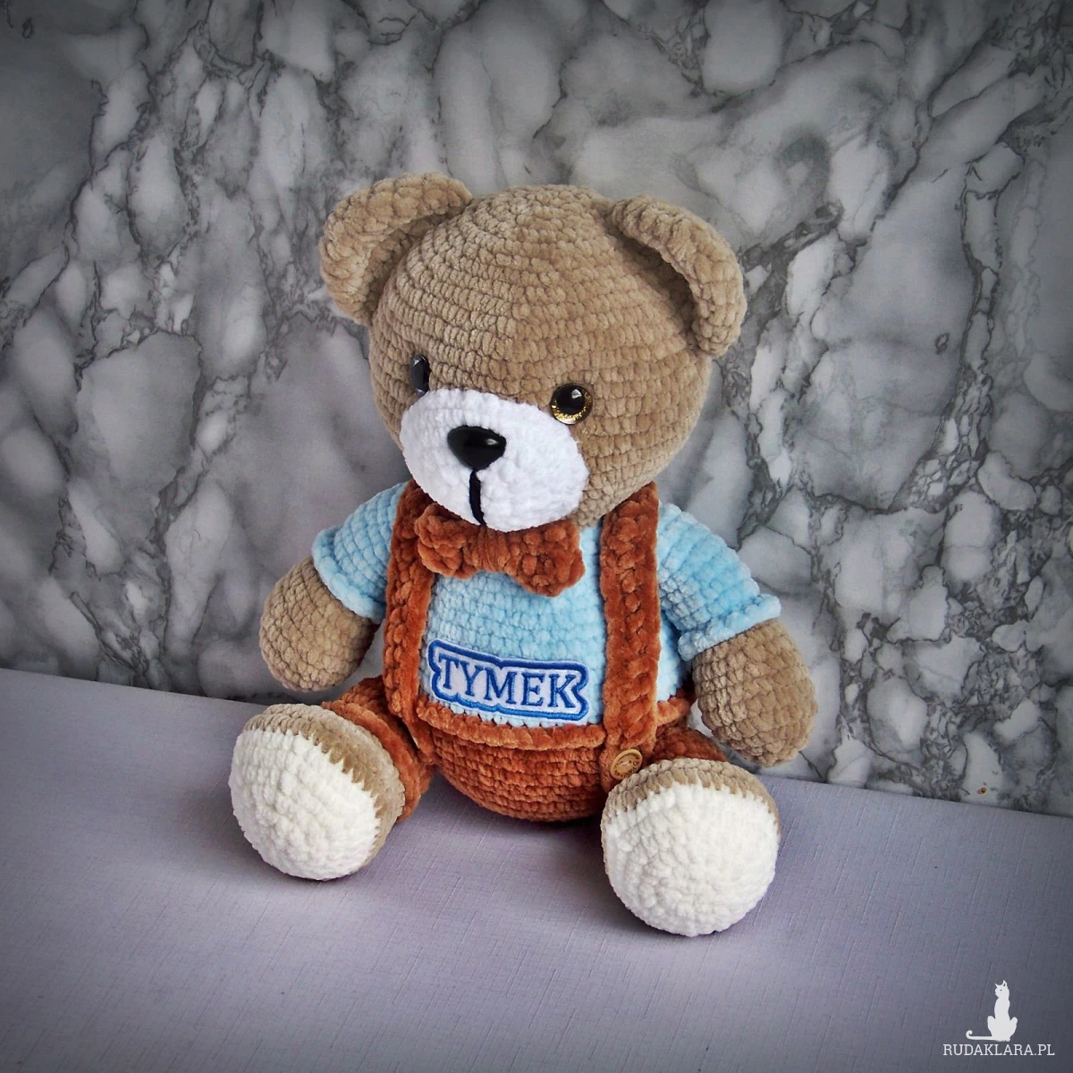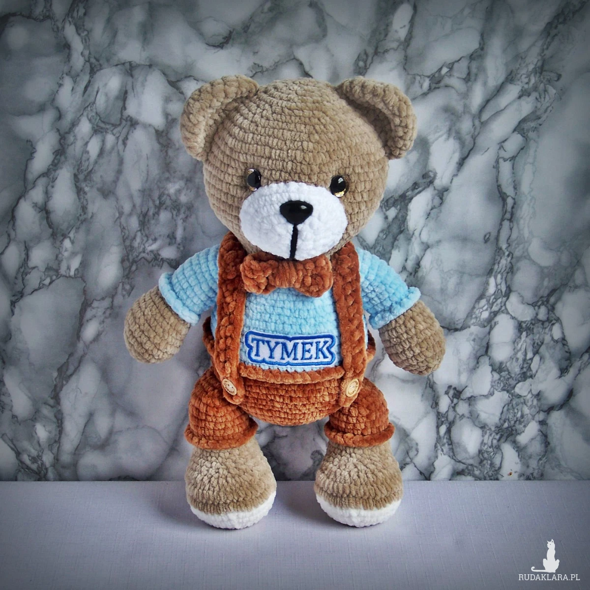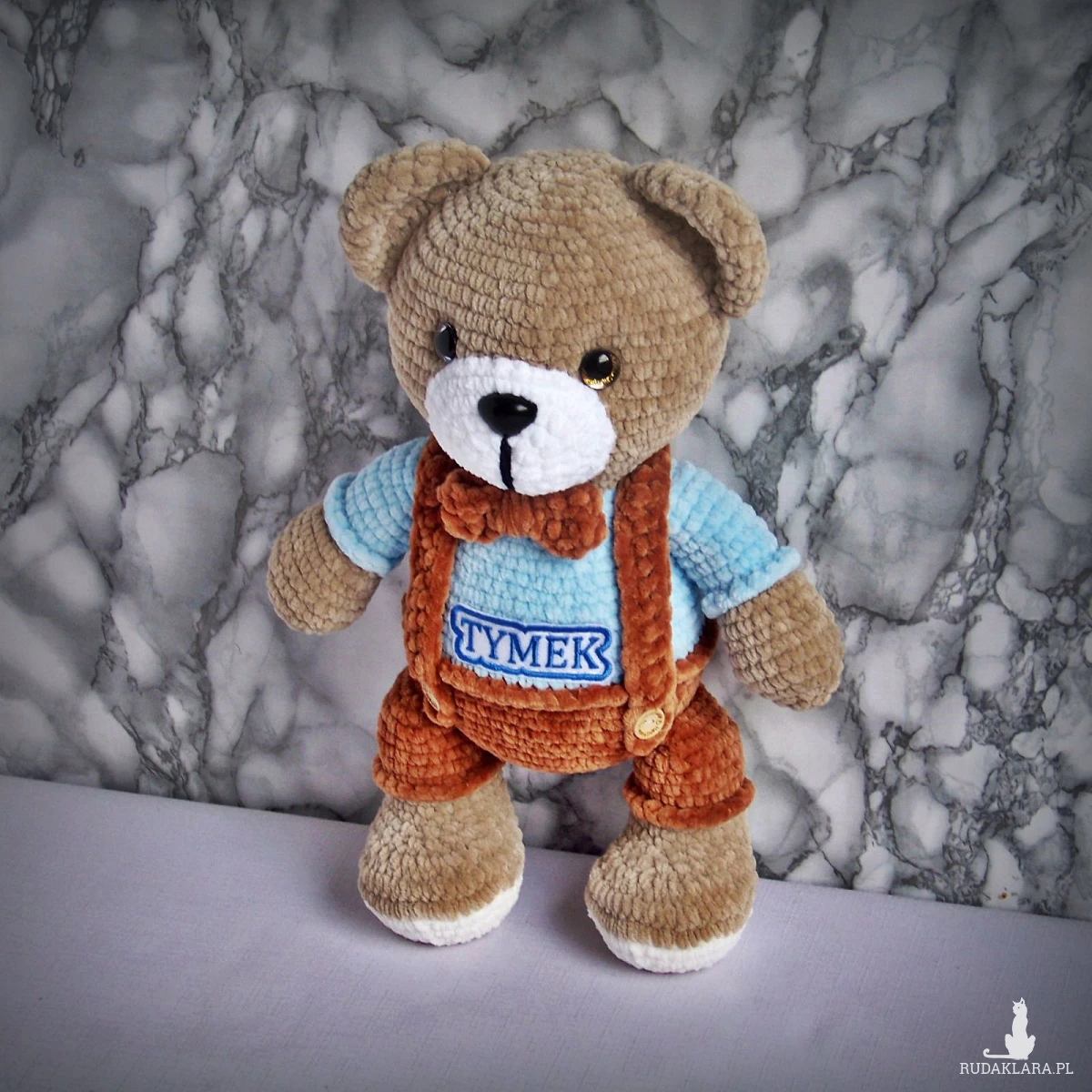 Szydełkowy miś Tymek 32cm w brązowych spodenkach (na zamówienie)