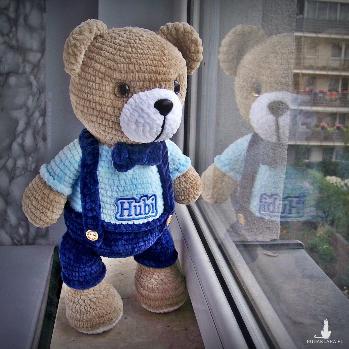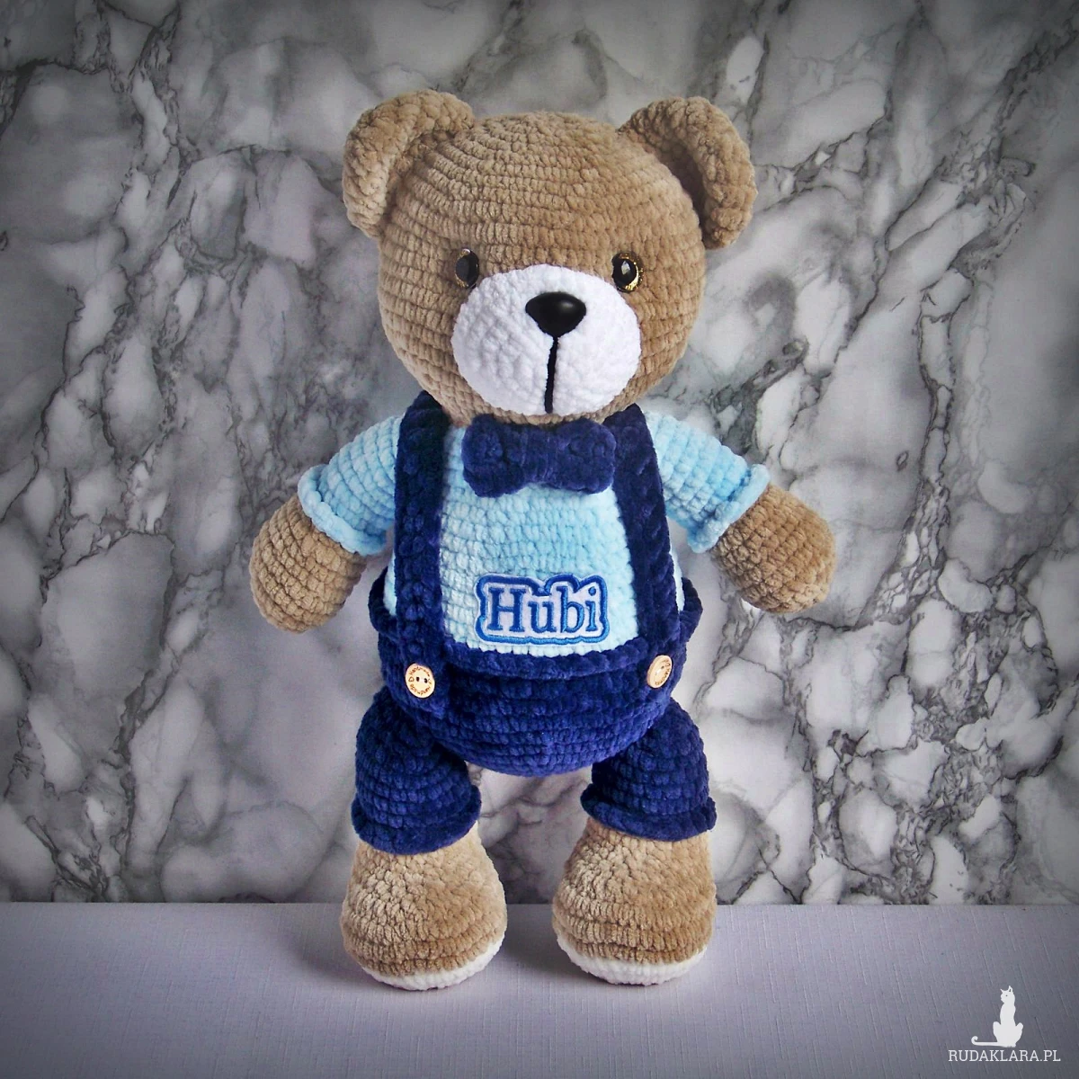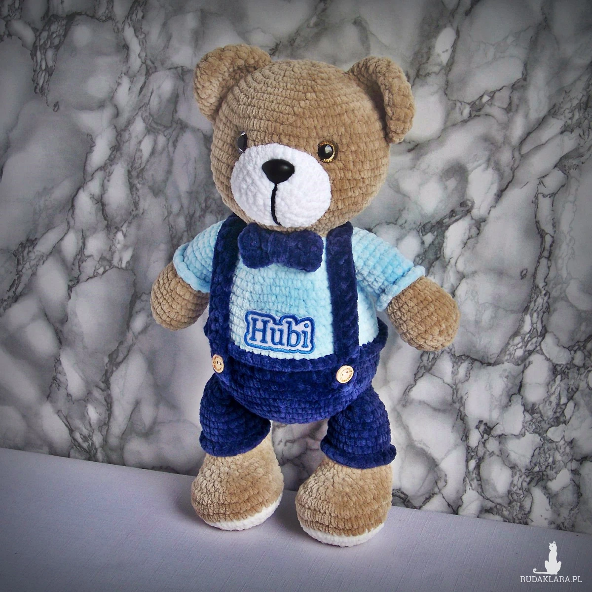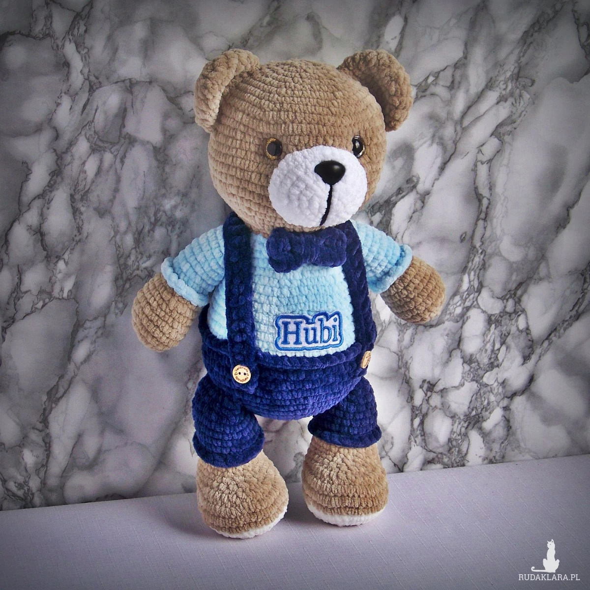 Szydełkowy miś Hubi 32cm w granatowych spodenkach (na zamówienie)