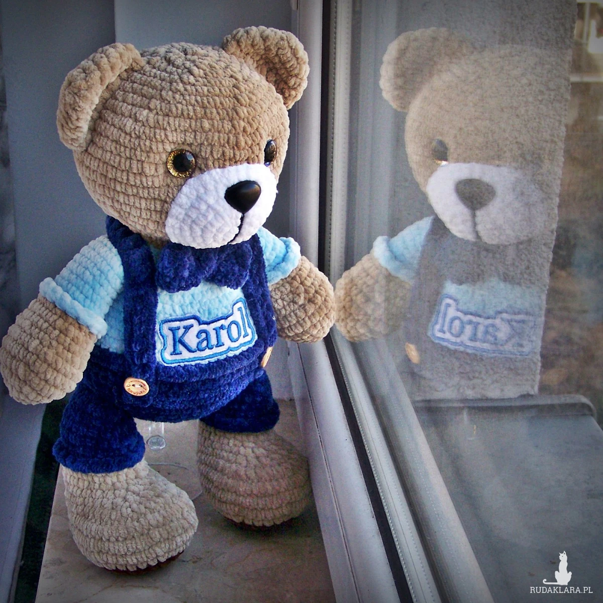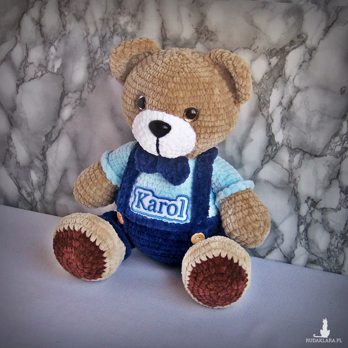 Szydełkowy miś Karol 32cm w granatowych spodenkach (na zamówienie)
