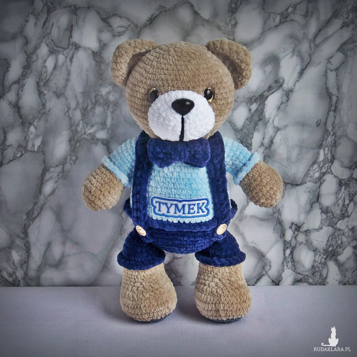 Szydełkowy miś Tymek 32cm w granatowych spodenkach (na zamówienie)