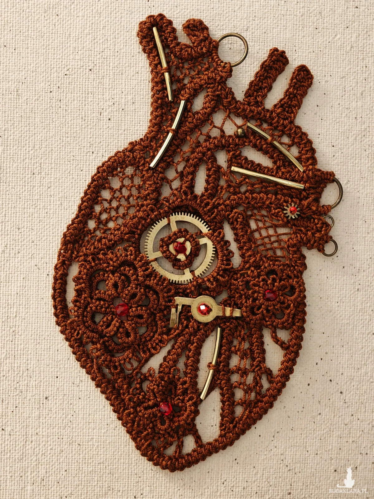 Koronkowe serce w urzekającym stylu steampunk! 🫀⚙️🧵Każdy detal, od delikatnych splotów po mosiężne zębatki i rubinowe akcenty, został stworzony z pasją do rzemiosła i niezwykłych form. To idealne połączenie wiktoriańskiej elegancji z mechaniczną precyzją.
