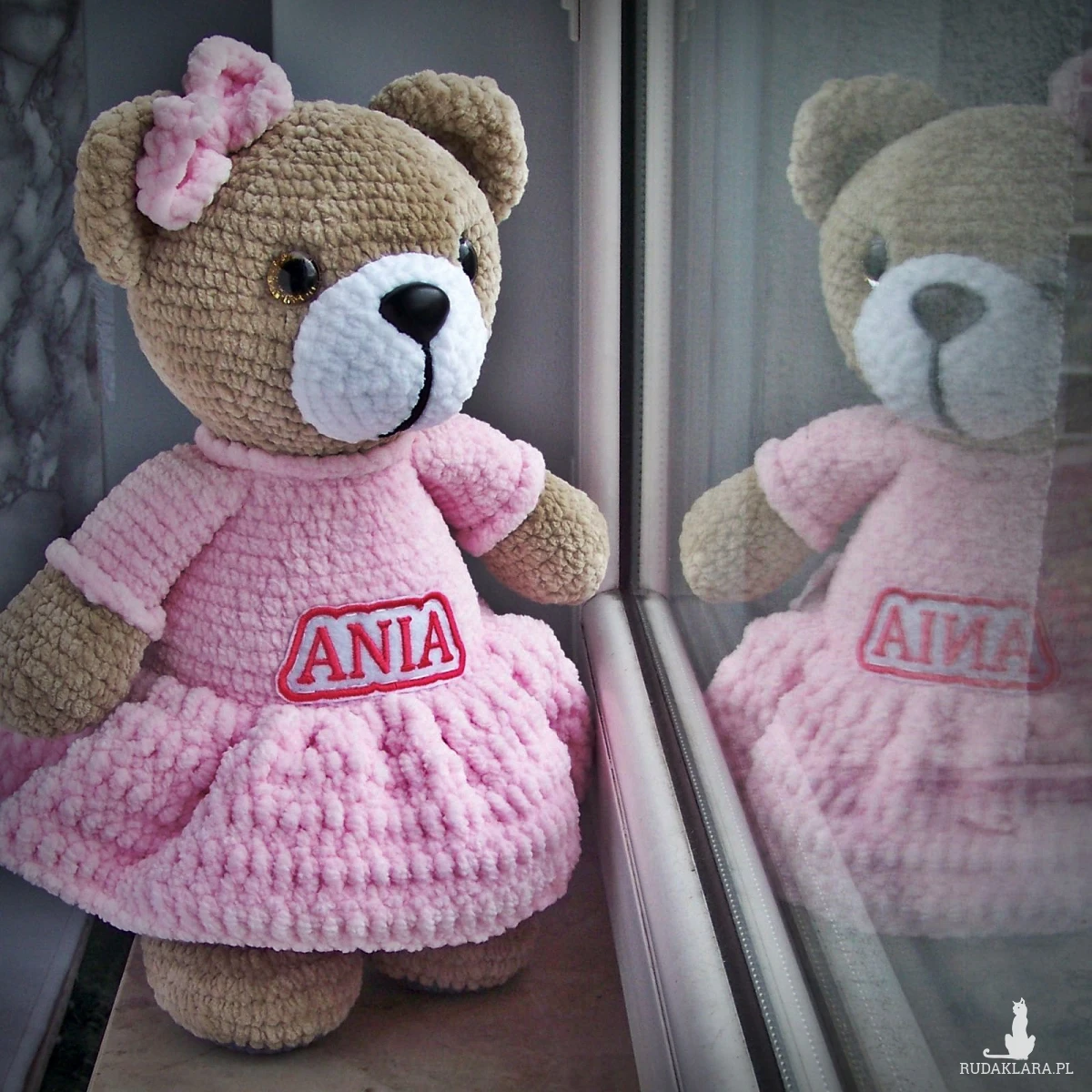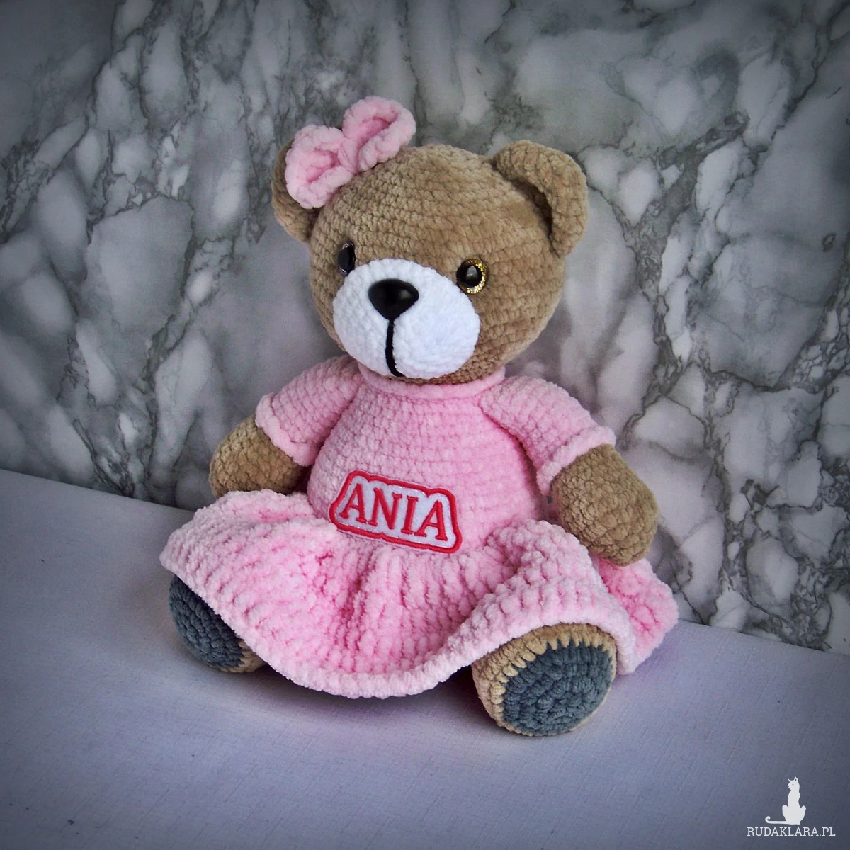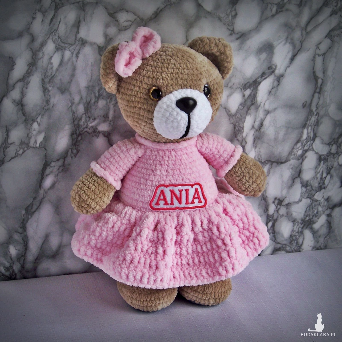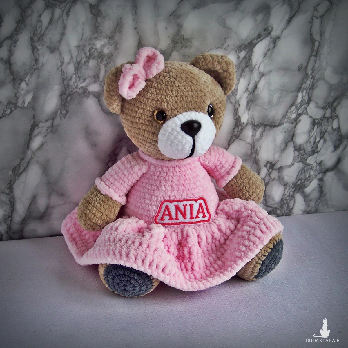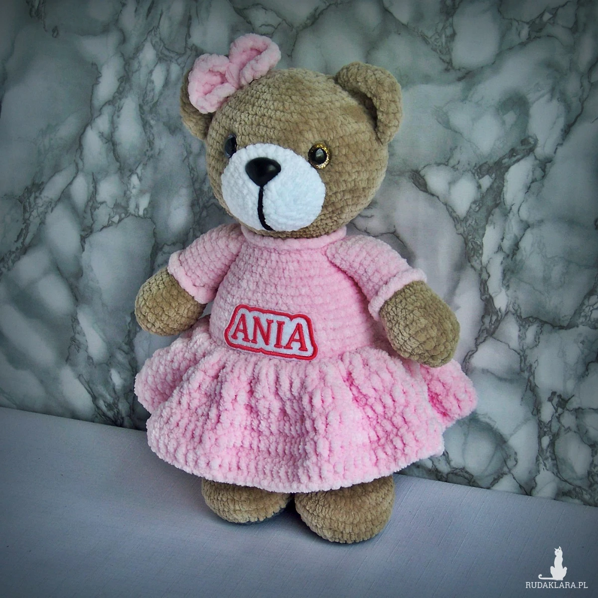 Szydełkowy miś Ania 32cm w jasnoróżowej sukience (na zamówienie)