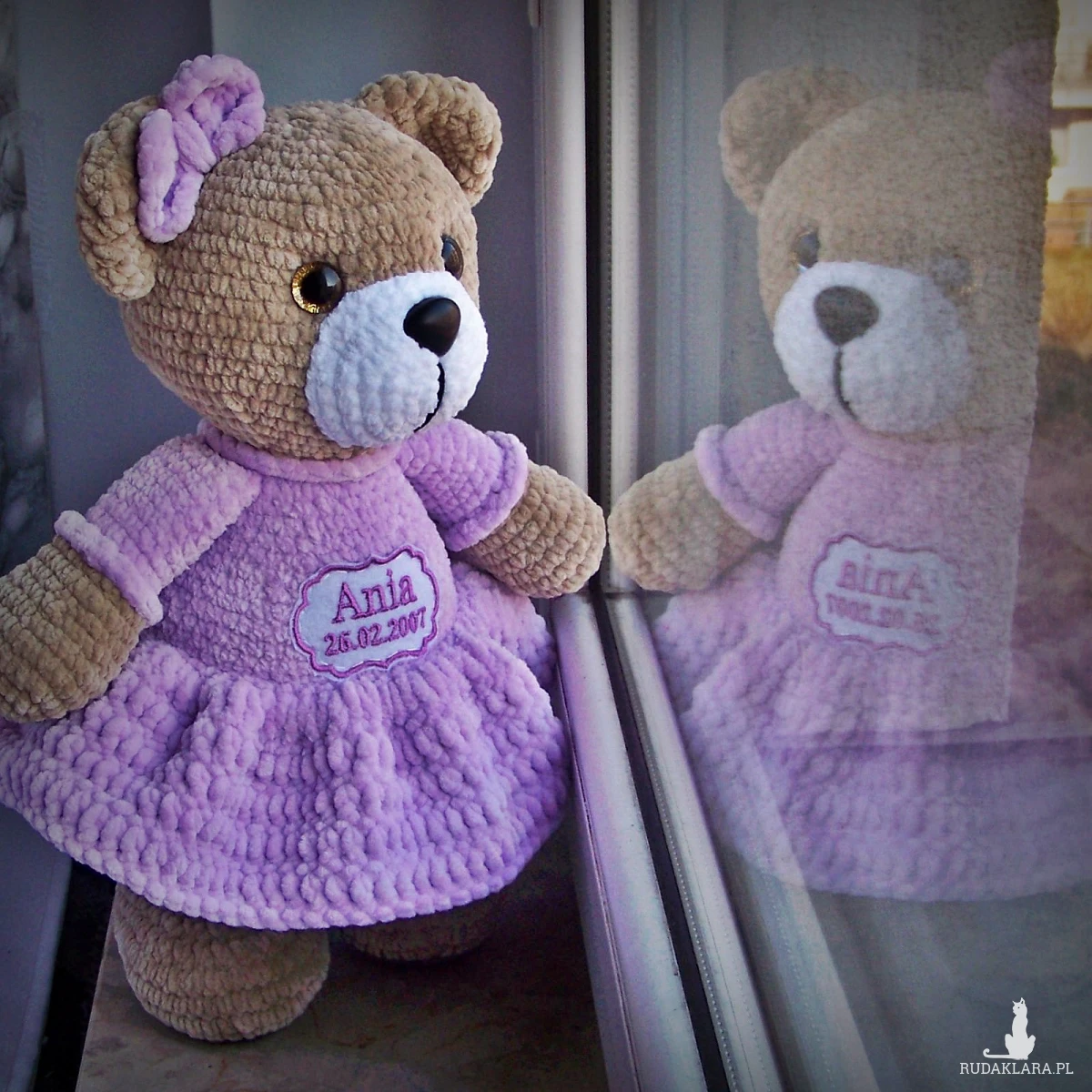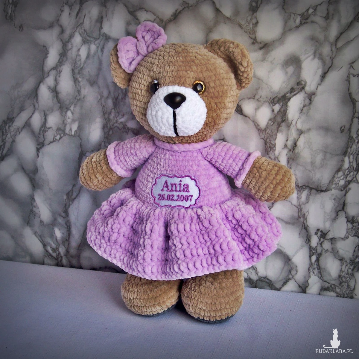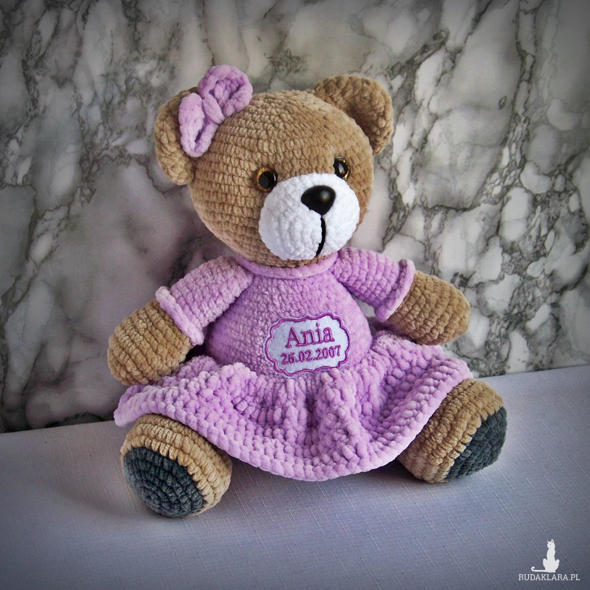 Szydełkowy miś Ania 32cm z datą urodzin w jasnofioletowej sukience (na zamówienie)